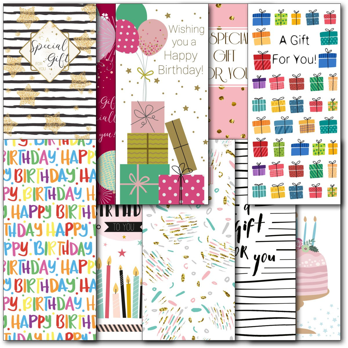 • DESIGNS ⭐No more than one money wallet of any design. Therefore pack consists of 10 different designs as shown. 3 fold design to hold voucher or notes inside. Balloons, Candles, Presents, Stripes, Patterns. Ideal for Adults & Children⭐