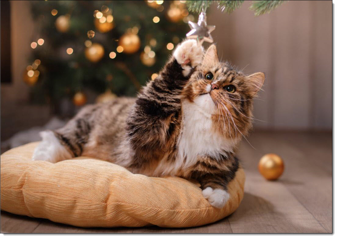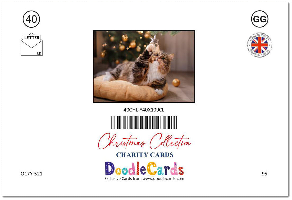 Pack of 10 Charity Christmas Cards Tortoiseshell Cat playing with Bauble