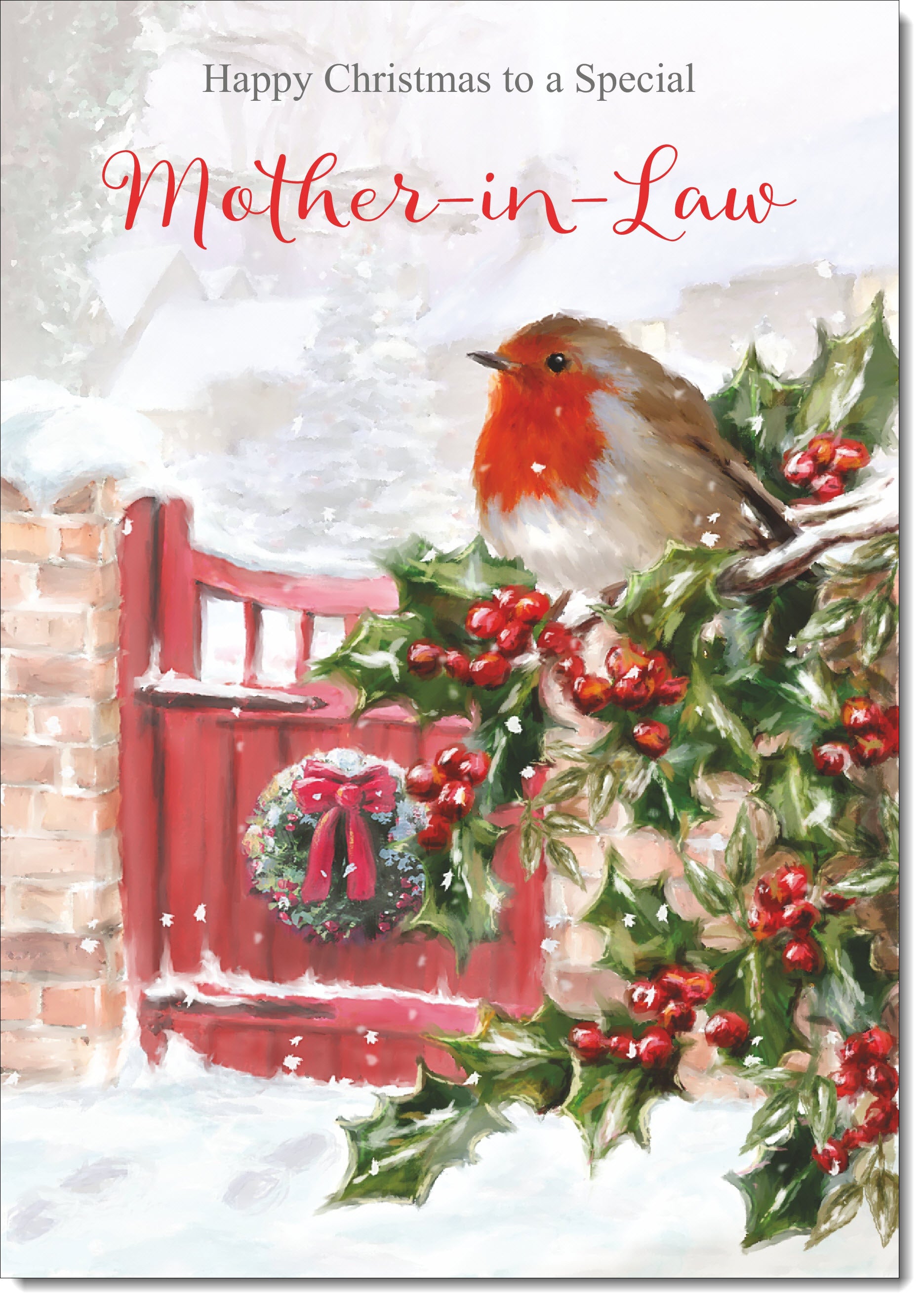 Mother-in-Law Christmas Card Robin on Holly Tree