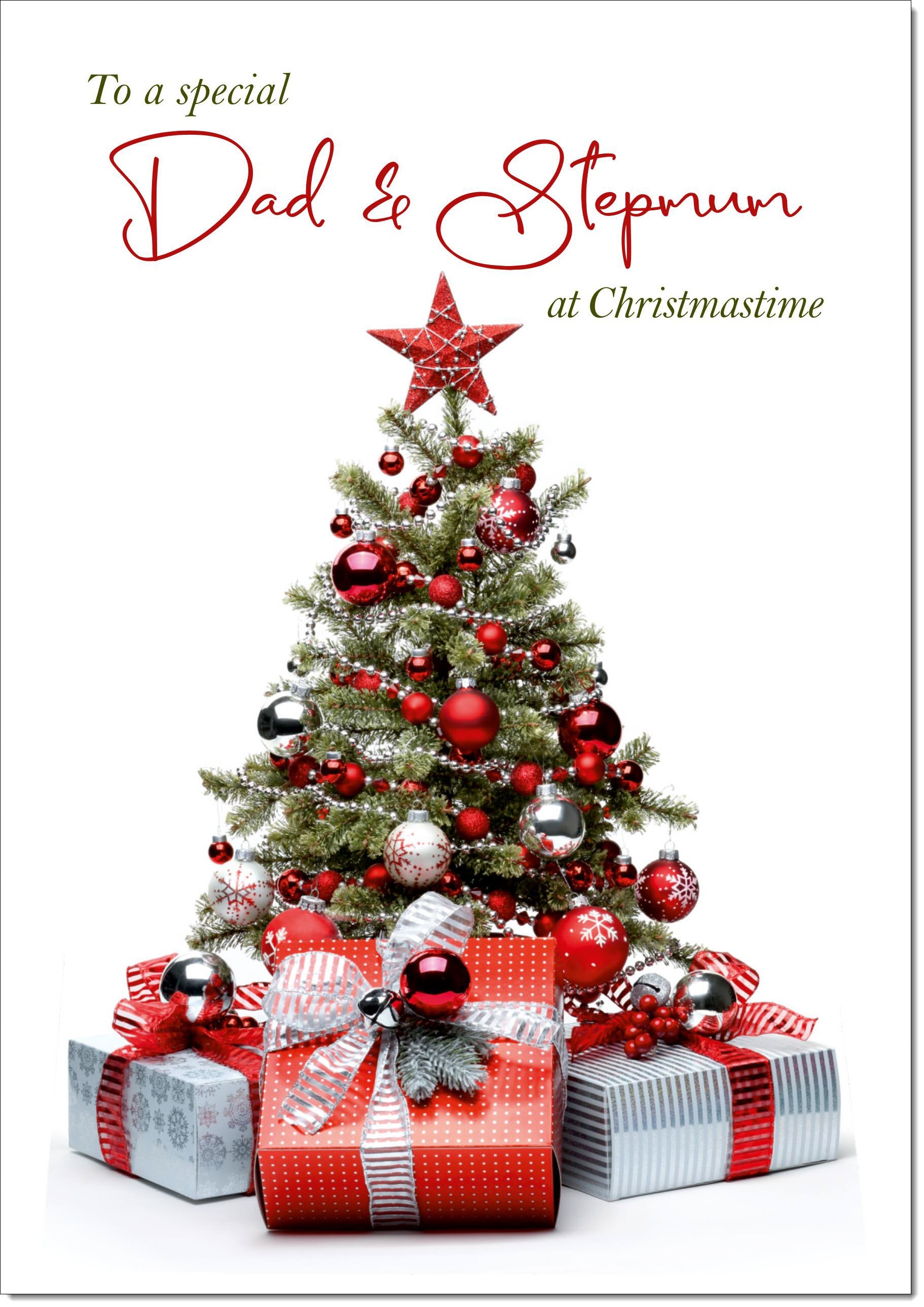 Dad & Stepmum Christmas Card Christmas Tree and Parcels