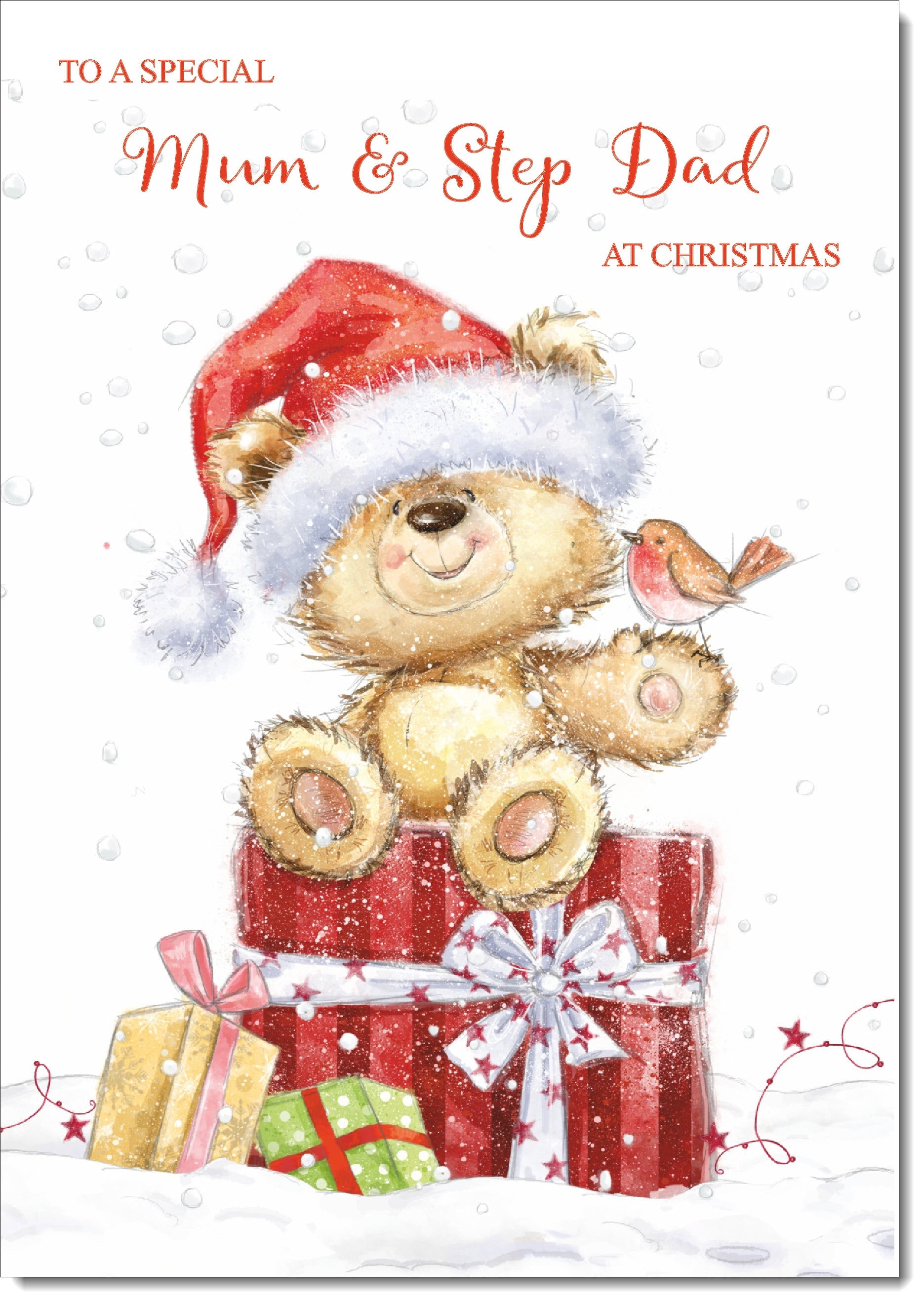 Mum & Stepdad Christmas Card Cute Bear on Parcel