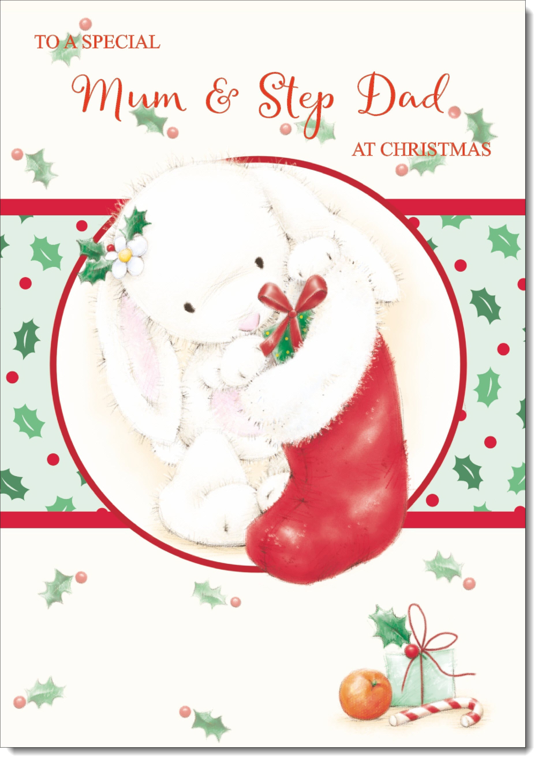 Mum & Stepdad Christmas Card Cute Rabbit with Stocking