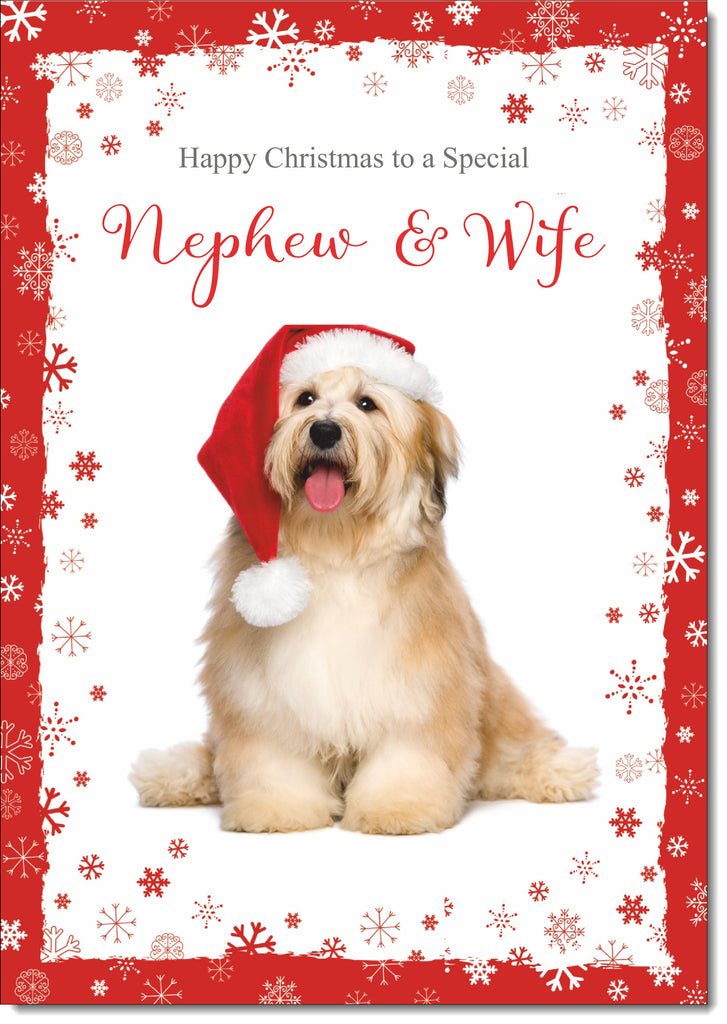 Nephew & Wife Christmas Card Fluffy Dog in Santa Hat