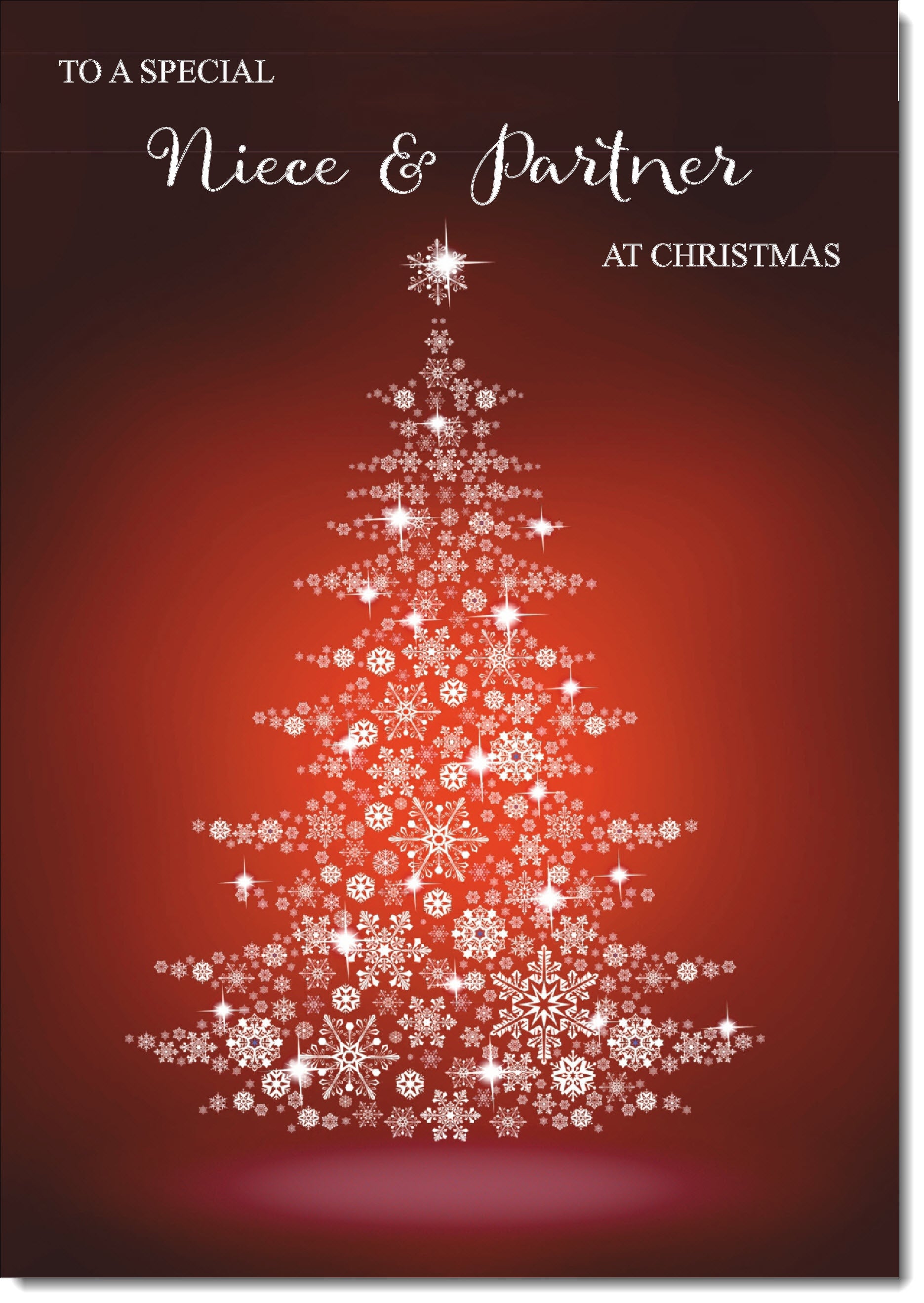 Niece & Partner Christmas Card Red Snowflake Christmas Tree