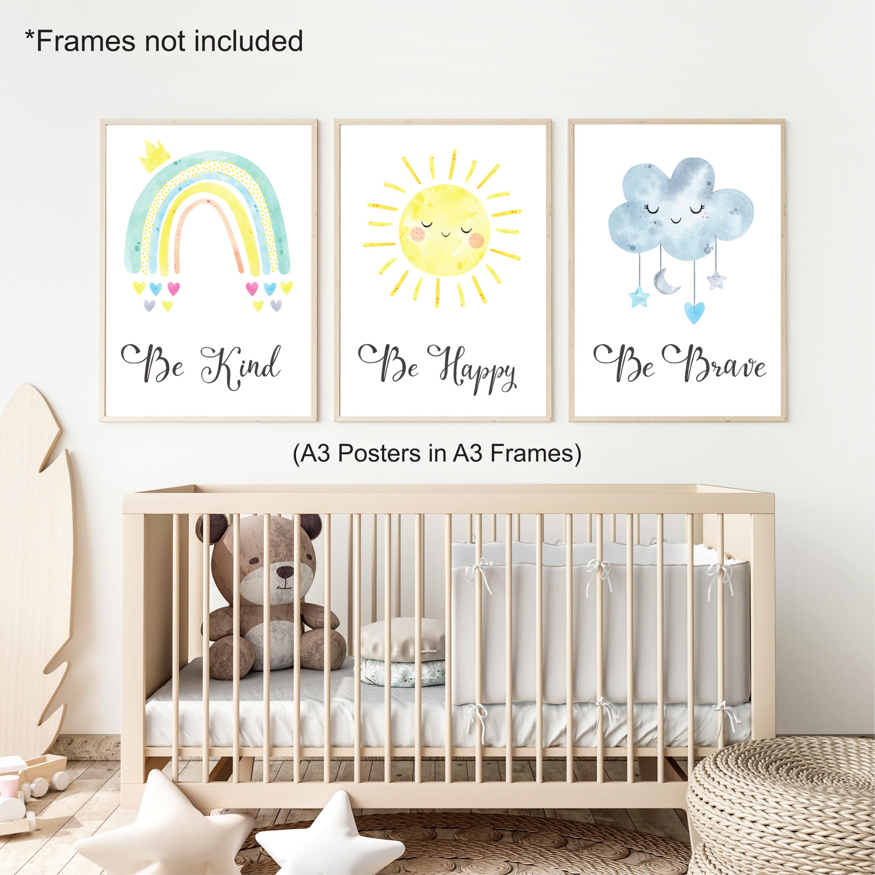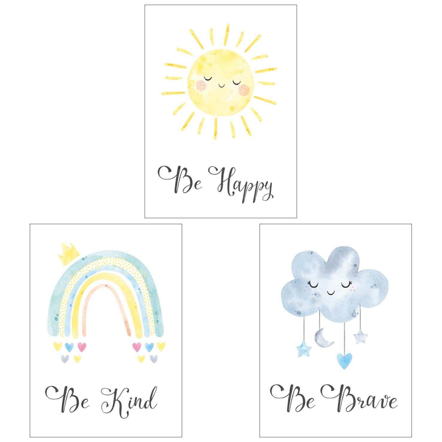 Set of 3 x A4 Size Nursery Be Kind Be Happy Be Brave Rainbow Unframed Quality Prints A4 or A3 Size (A4 210 x 297mm, A3 297 x 420mm)(A4 8.3 x 11.7", A3 11.7 x 16.5") Printed in the UK on 100% Recyclable Thick 350gsm Luxury Matt Board Supplied UNFRAMED but look great as they are. Delivered flat - not rolled. Ready to Frame - Easy to Purchase A4 or A3 Frames online. No cutting required.
