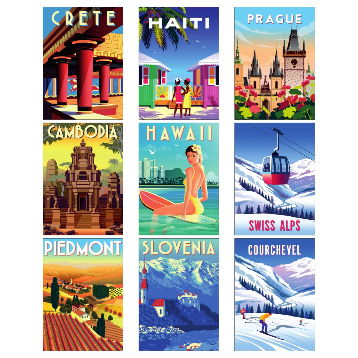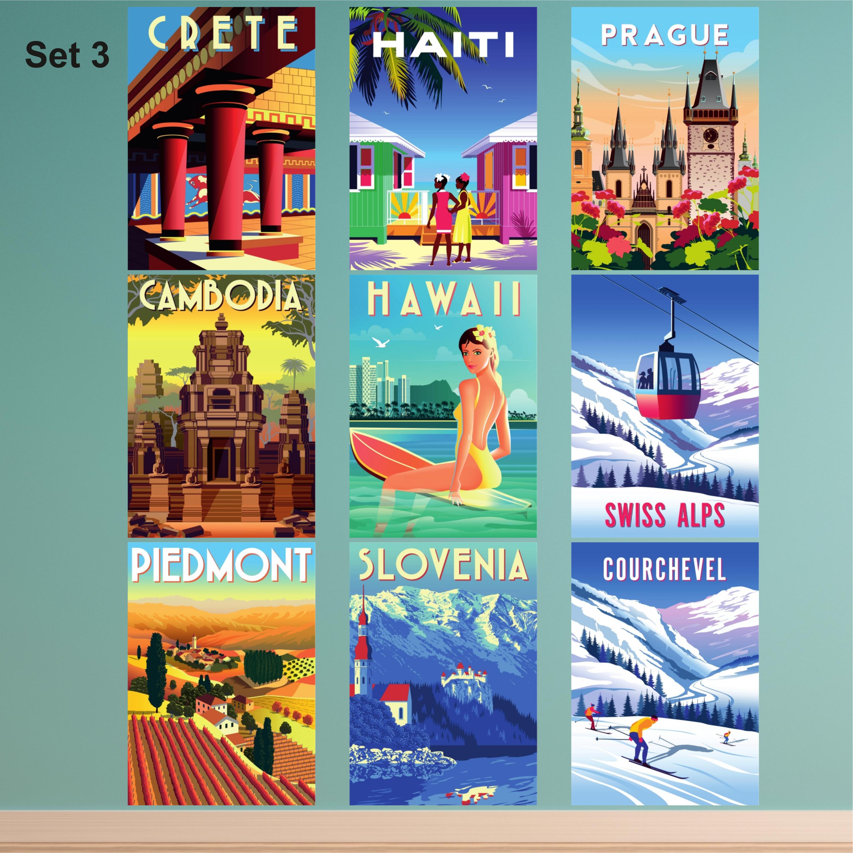 Retro Travel Set 3 out of 5 Matching Sets Unframed Quality Prints A4 or A3 Size (A4 210 x 297mm, A3 297 x 420mm)(A4 8.3 x 11.7", A3 11.7 x 16.5") Printed in the UK on 100% Recyclable Thick 350gsm Luxury Matt Board Supplied UNFRAMED but look great as they are. Delivered flat - not rolled. Ready to Frame - Easy to Purchase A4 or A3 Frames online. No cutting required.