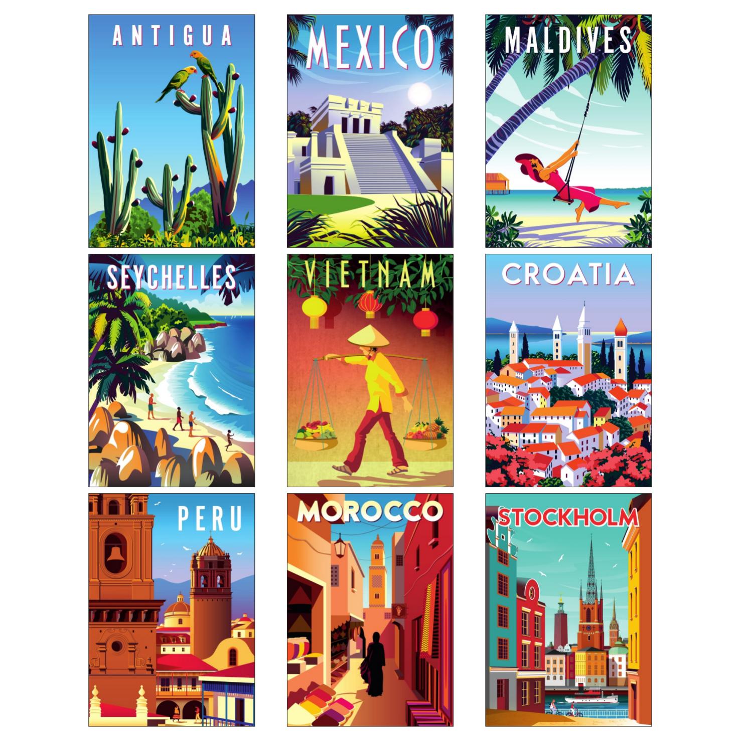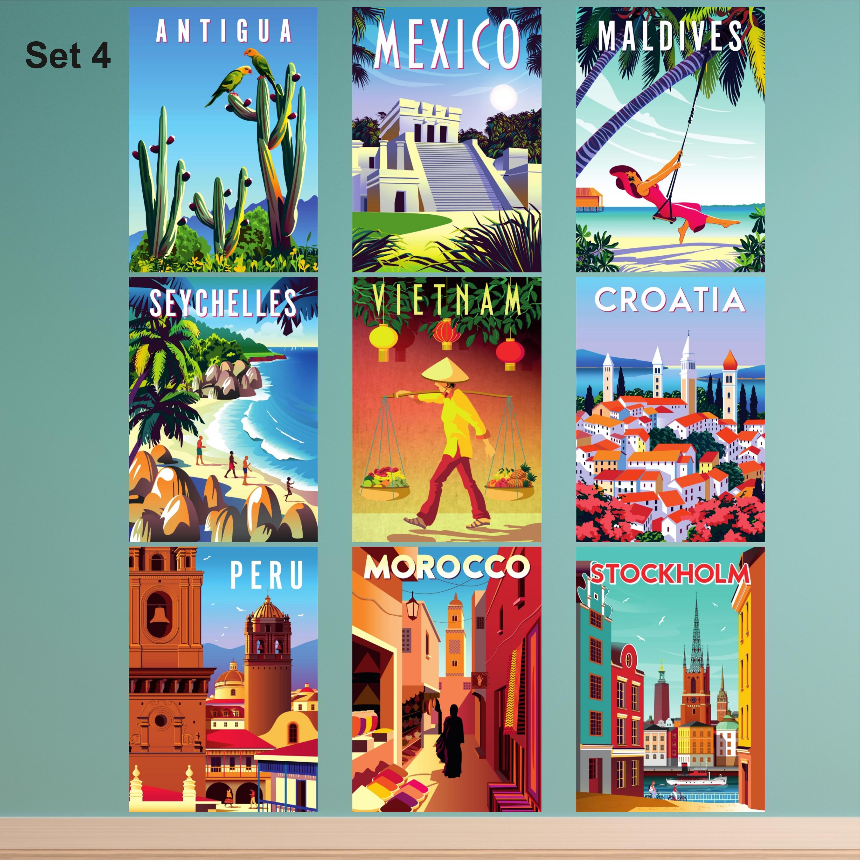 Retro Travel Set 4 out of 5 Matching Sets Unframed Quality Prints A4 or A3 Size (A4 210 x 297mm, A3 297 x 420mm)(A4 8.3 x 11.7", A3 11.7 x 16.5") Printed in the UK on 100% Recyclable Thick 350gsm Luxury Matt Board Supplied UNFRAMED but look great as they are. Delivered flat - not rolled. Ready to Frame - Easy to Purchase A4 or A3 Frames online. No cutting required.