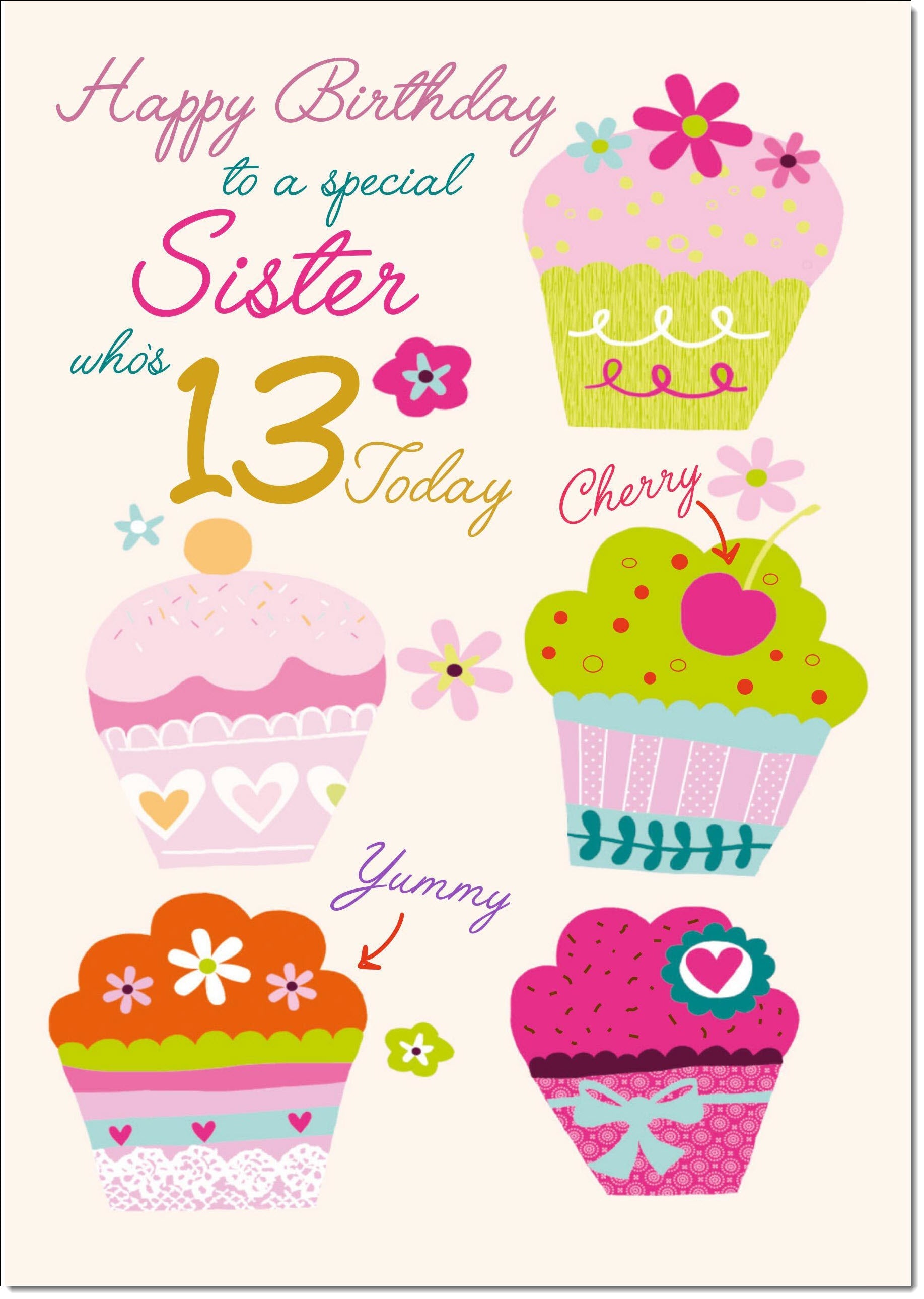 Sister 13th Birthday Card Age 13 Bright Cupcakes