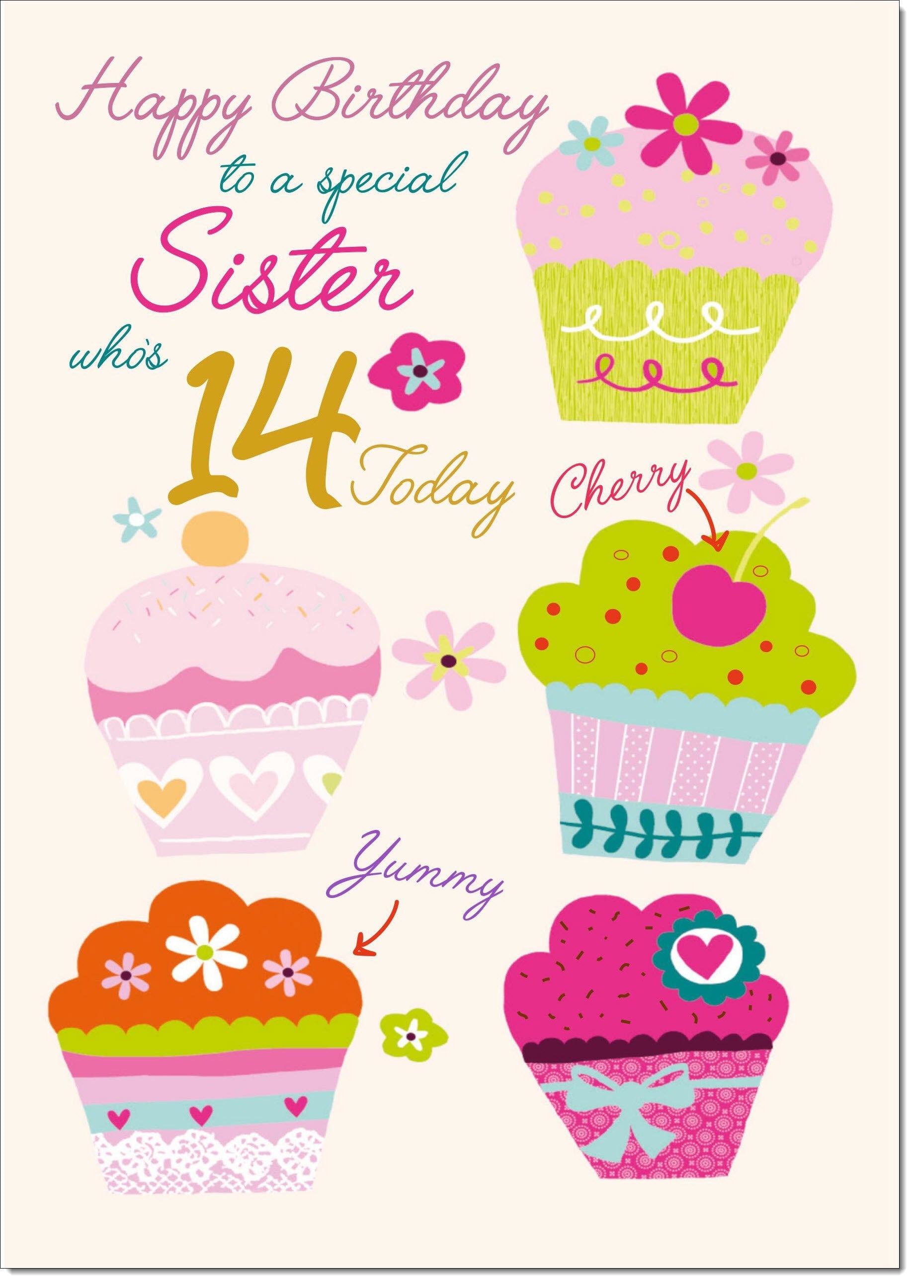 Sister 14th Birthday Card Age 14 Bright Cupcakes