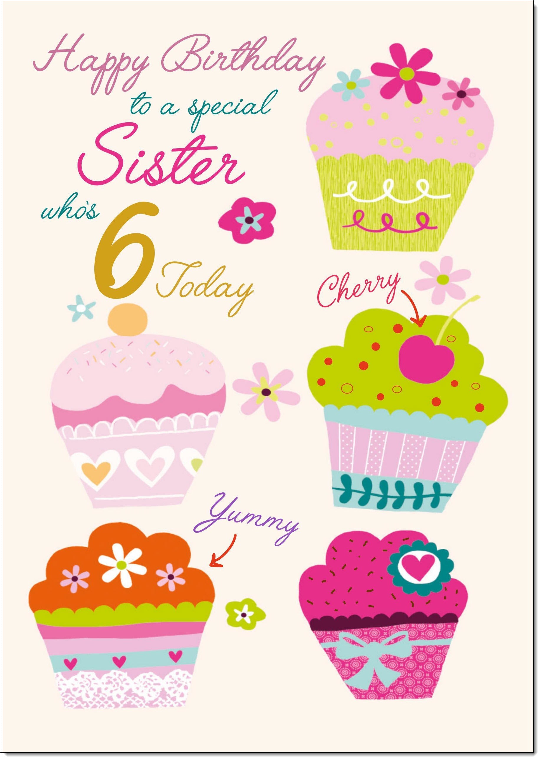 Sister 6th Birthday Card Age 6 Bright Cupcakes