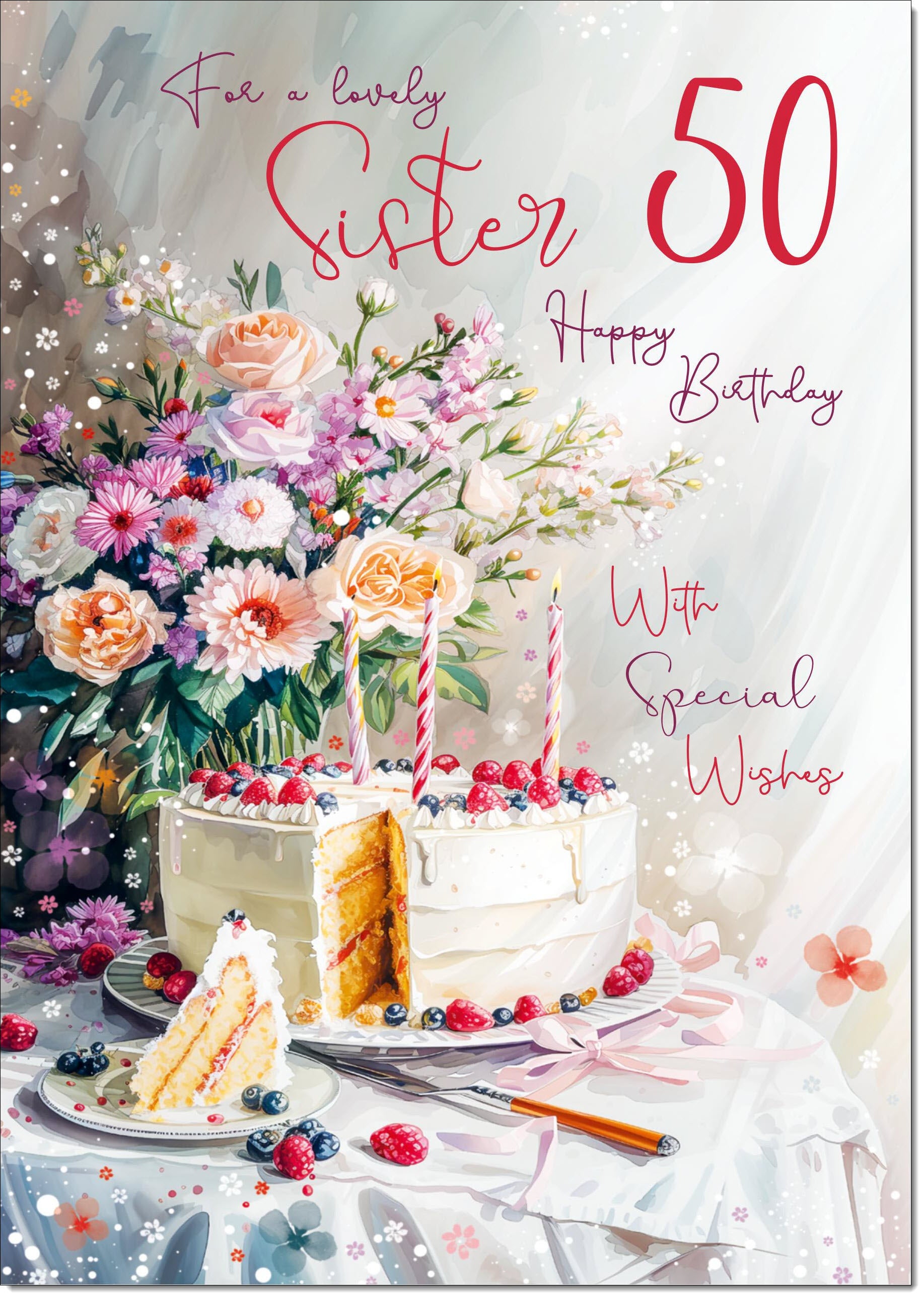 Sister 50th Birthday Card Age 50 Birthday Cake and Flowers