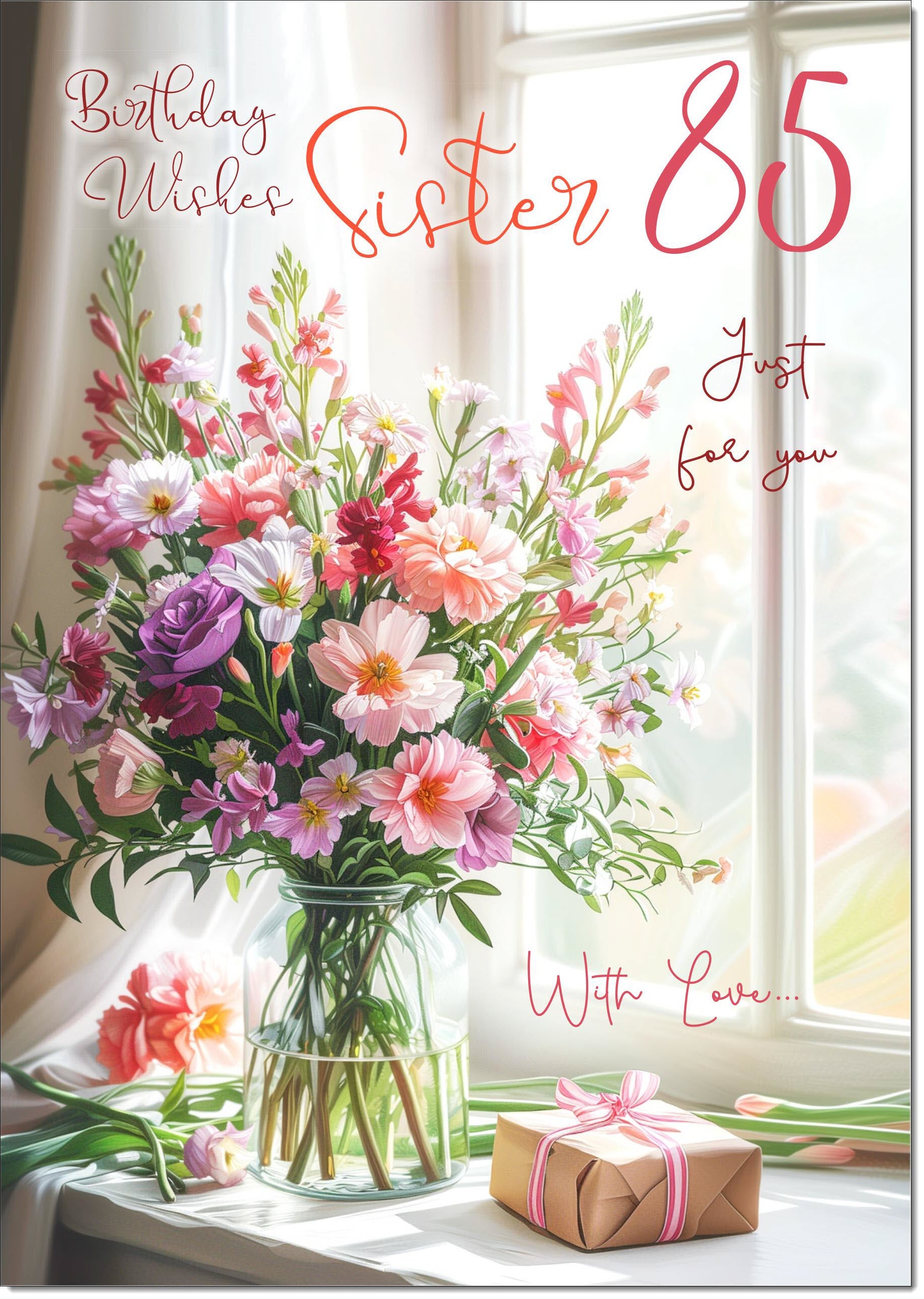 Sister 85th Birthday Card Age 85 Flower Bouquet and Present