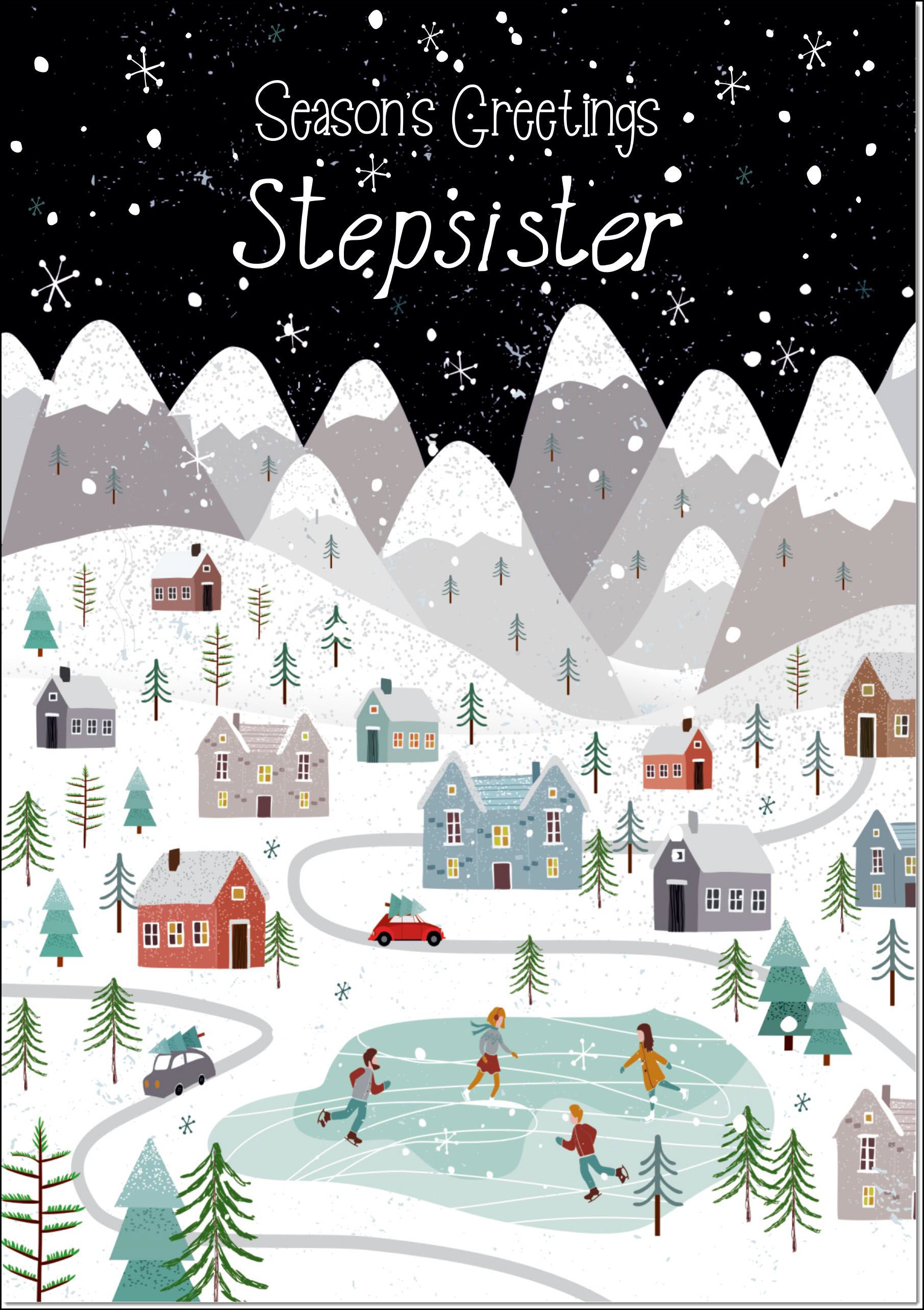 Stepsister Christmas Card Mountain Scene In Snowy Village
