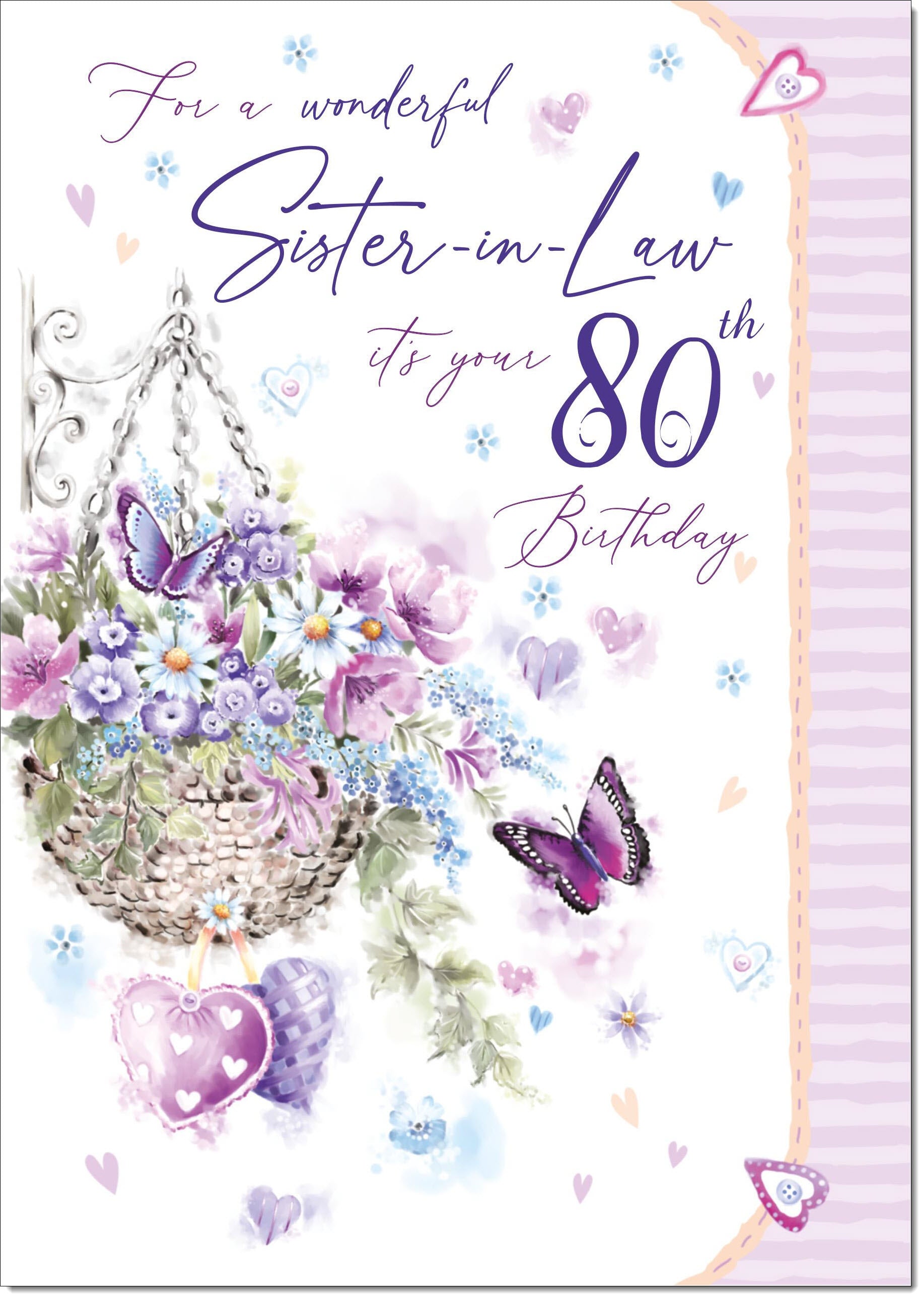 Sister-in-Law 80th Birthday Card Age 80 Purple Hanging Basket