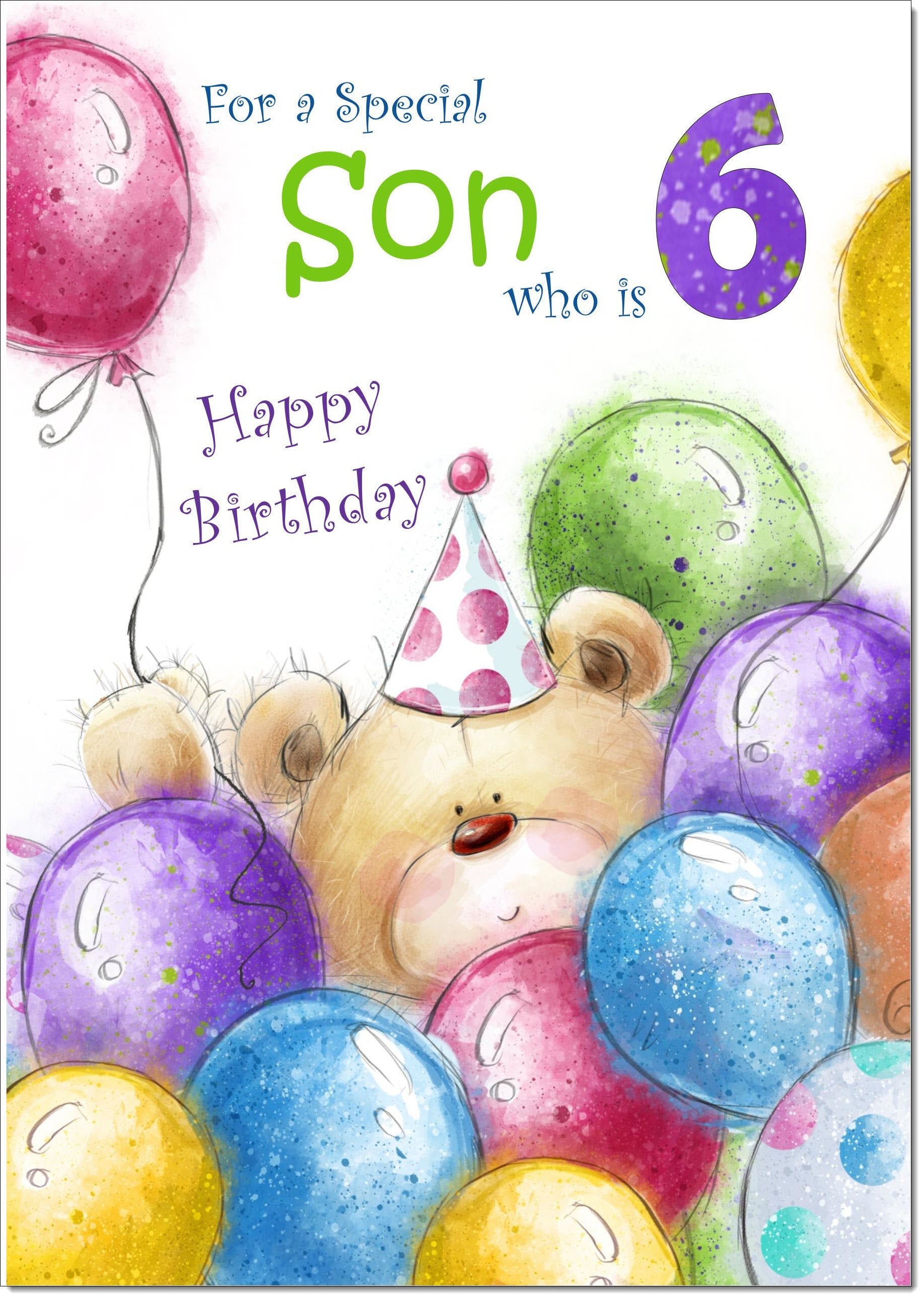 Son 6th Birthday Card Age 6 Cute Teddy Bear in Balloons