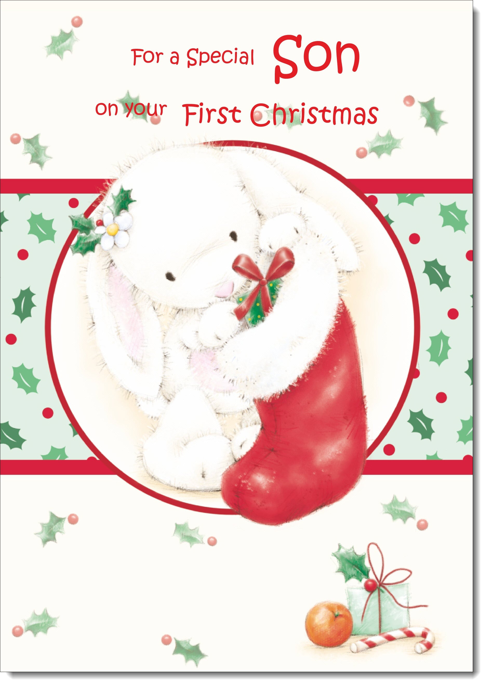 Sons 1st Christmas Card Cute Rabbit with Stocking