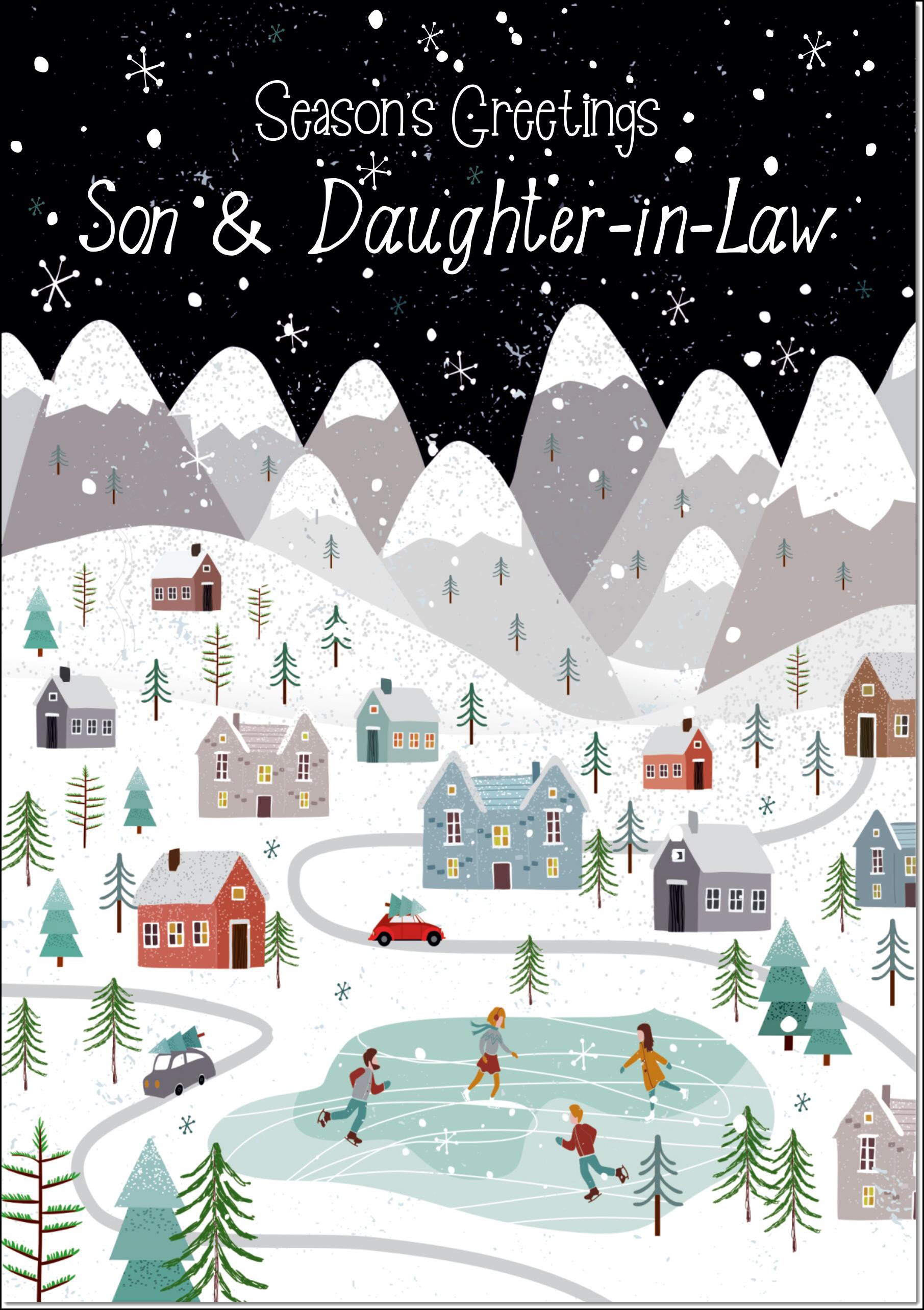Son & Daughter-in-Law Christmas Card Mountain Scene In Snowy Village