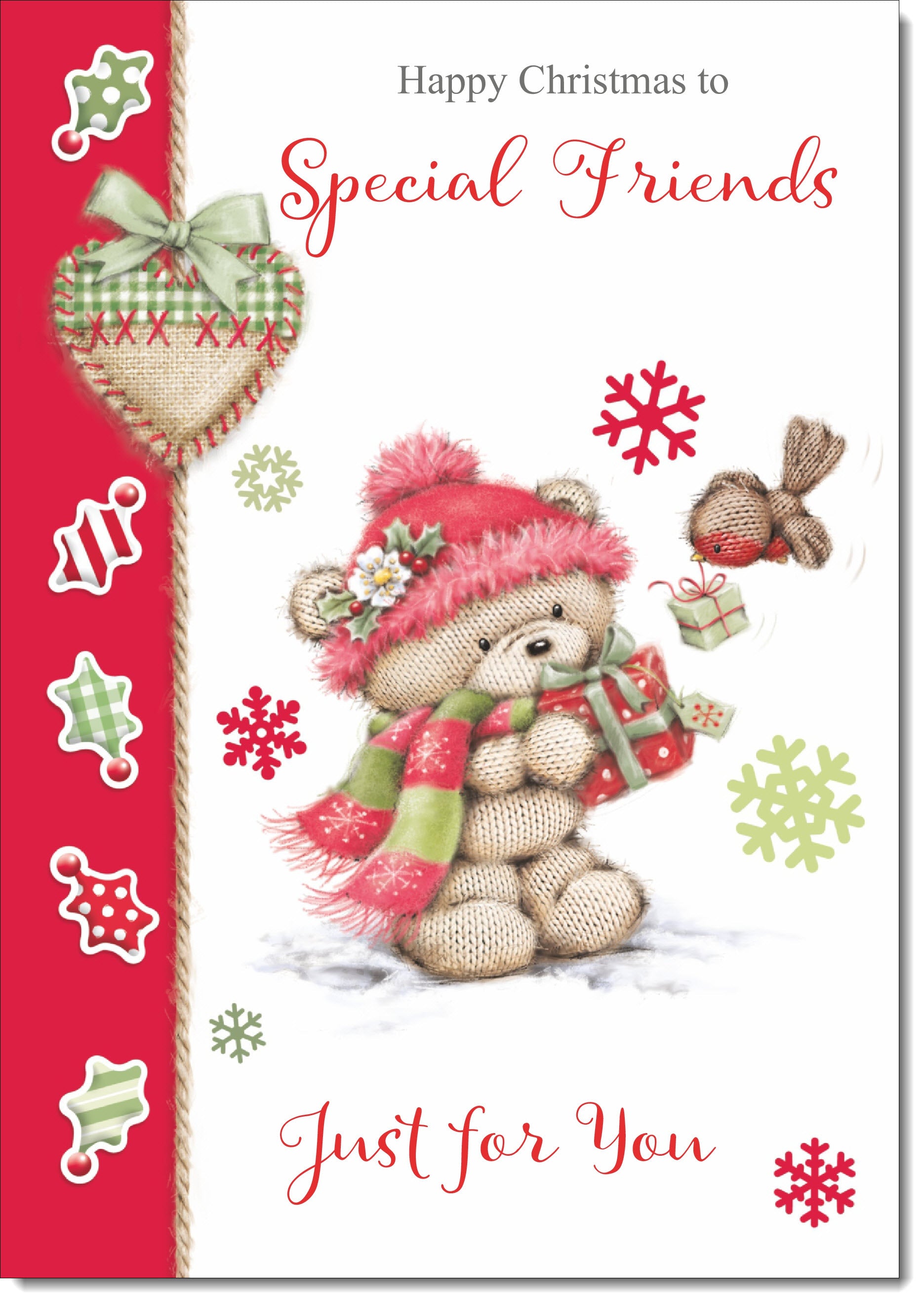 Special Friends Christmas Card Cute Bear in Pink Bobble Hat