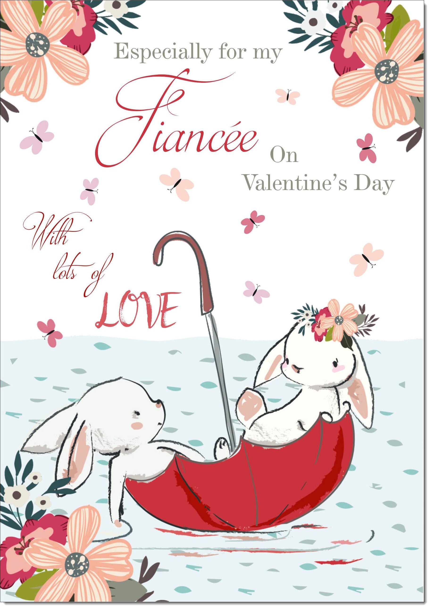 Fiancee Valentines Card Rabbits Floating in Whimsical Umbrella