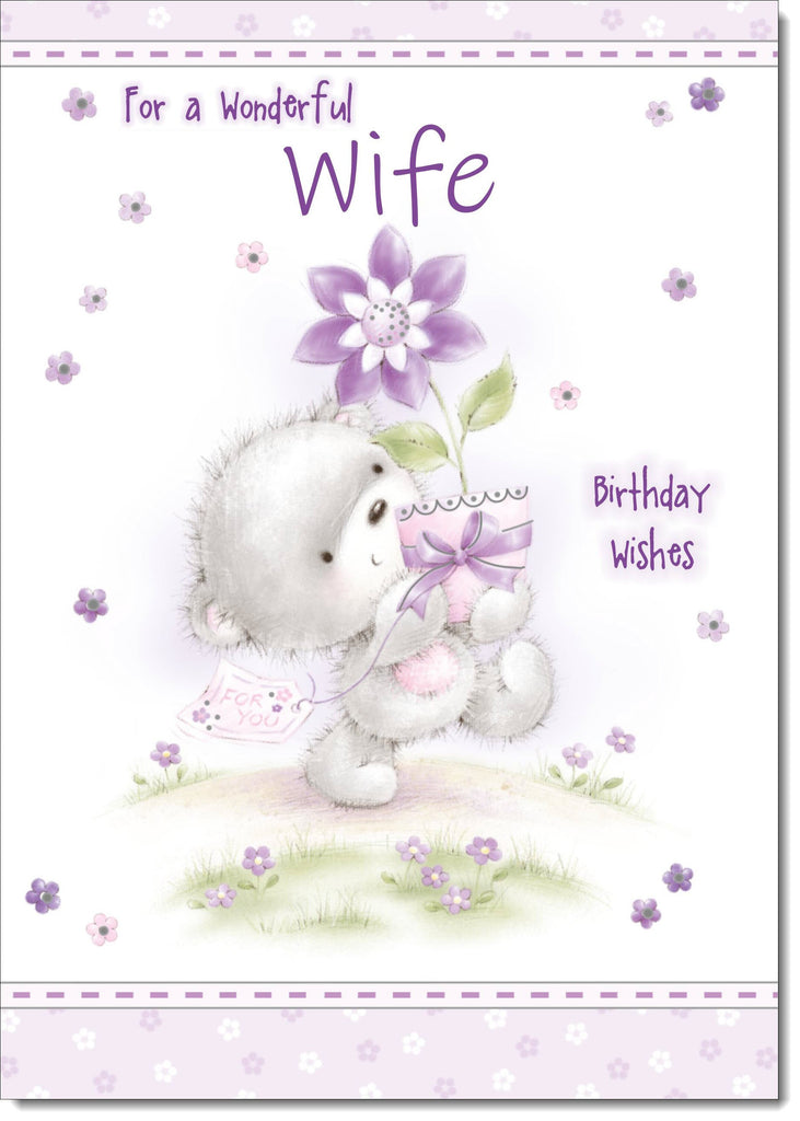 Wife Birthday Card Teddy with Love Heart and Flowers
