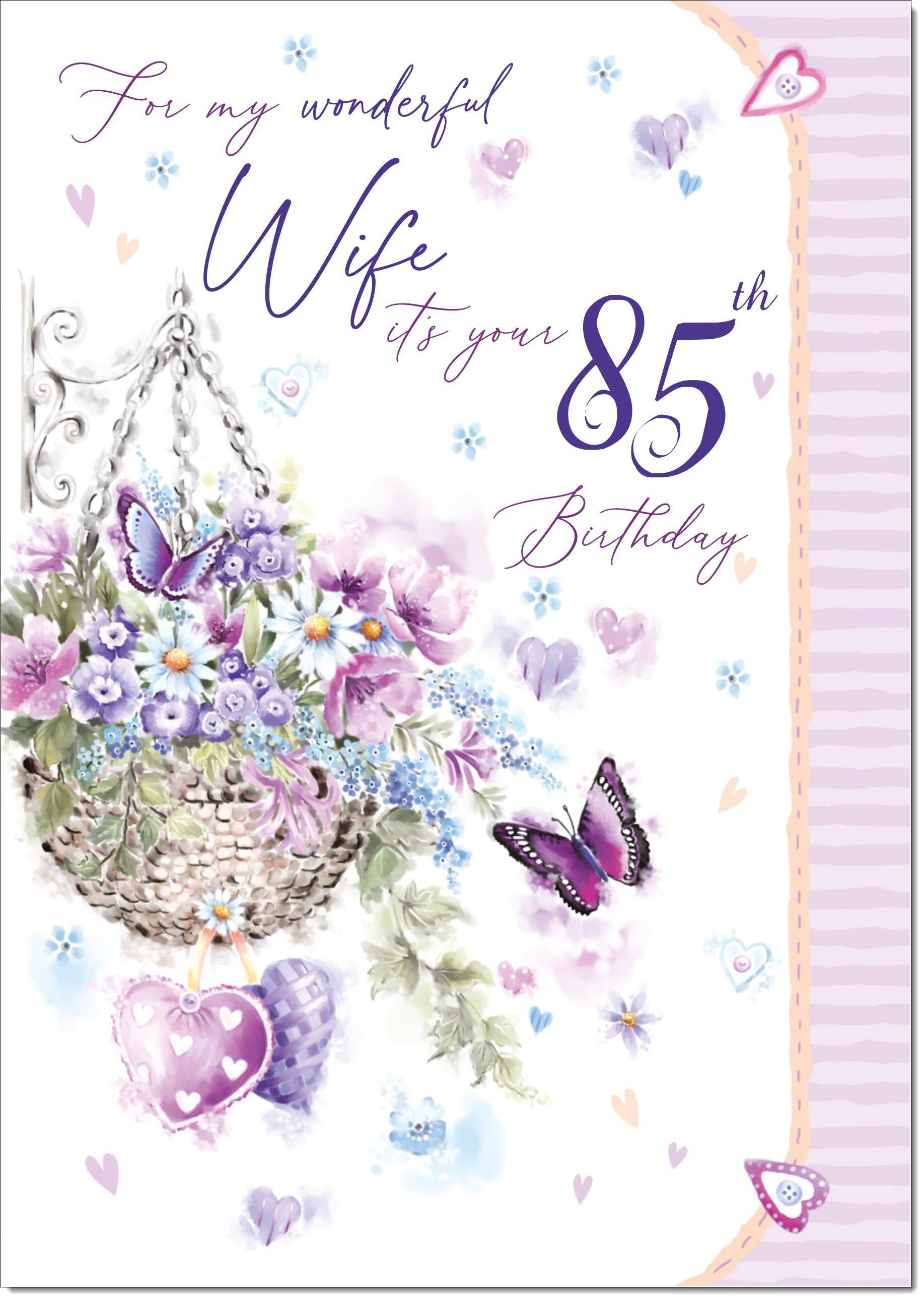 Wife 85th Birthday Card Age 85 Purple Hanging Basket
