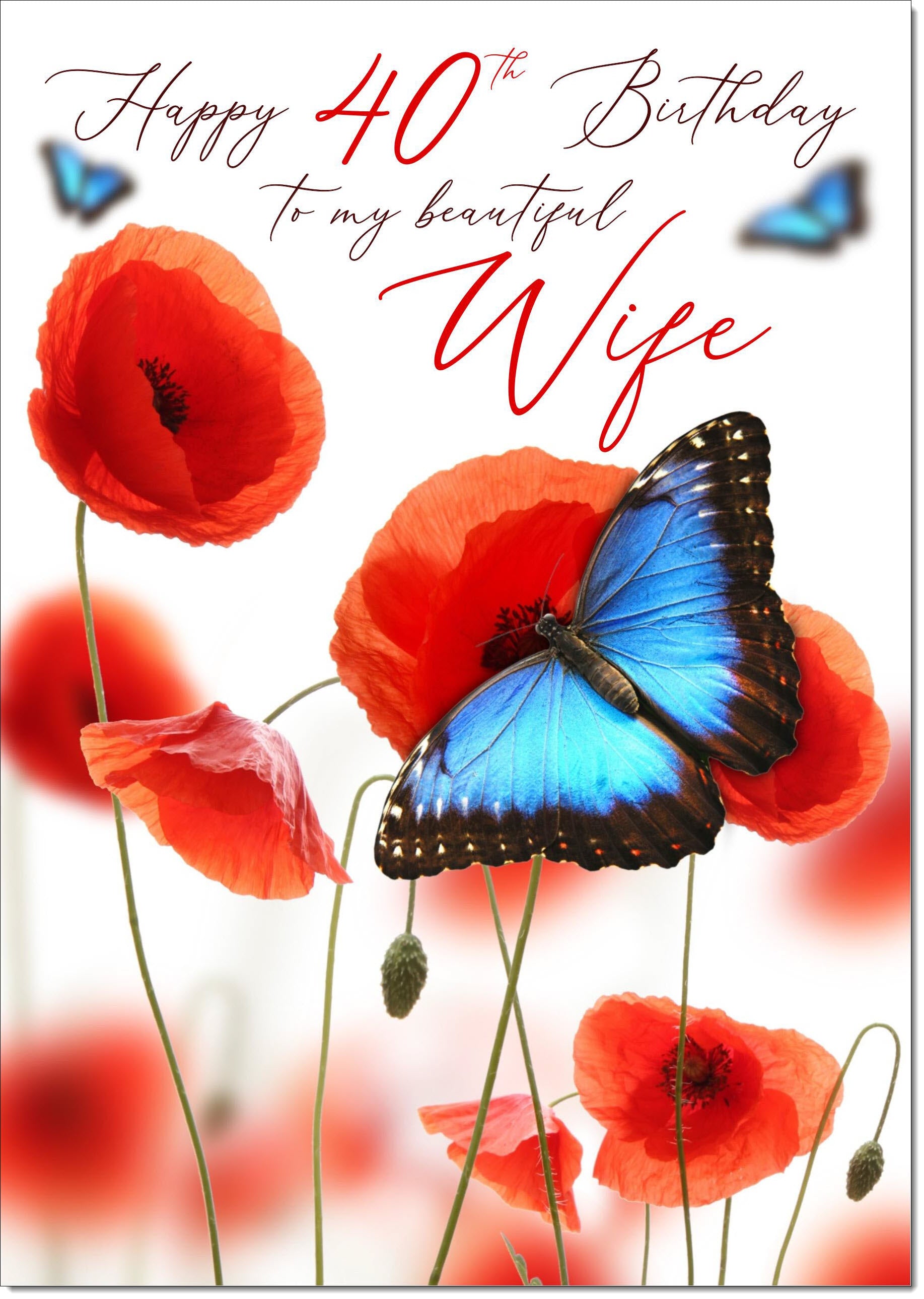 Wife 40th Birthday Card Age 40 Poppies and Blue Butterflies