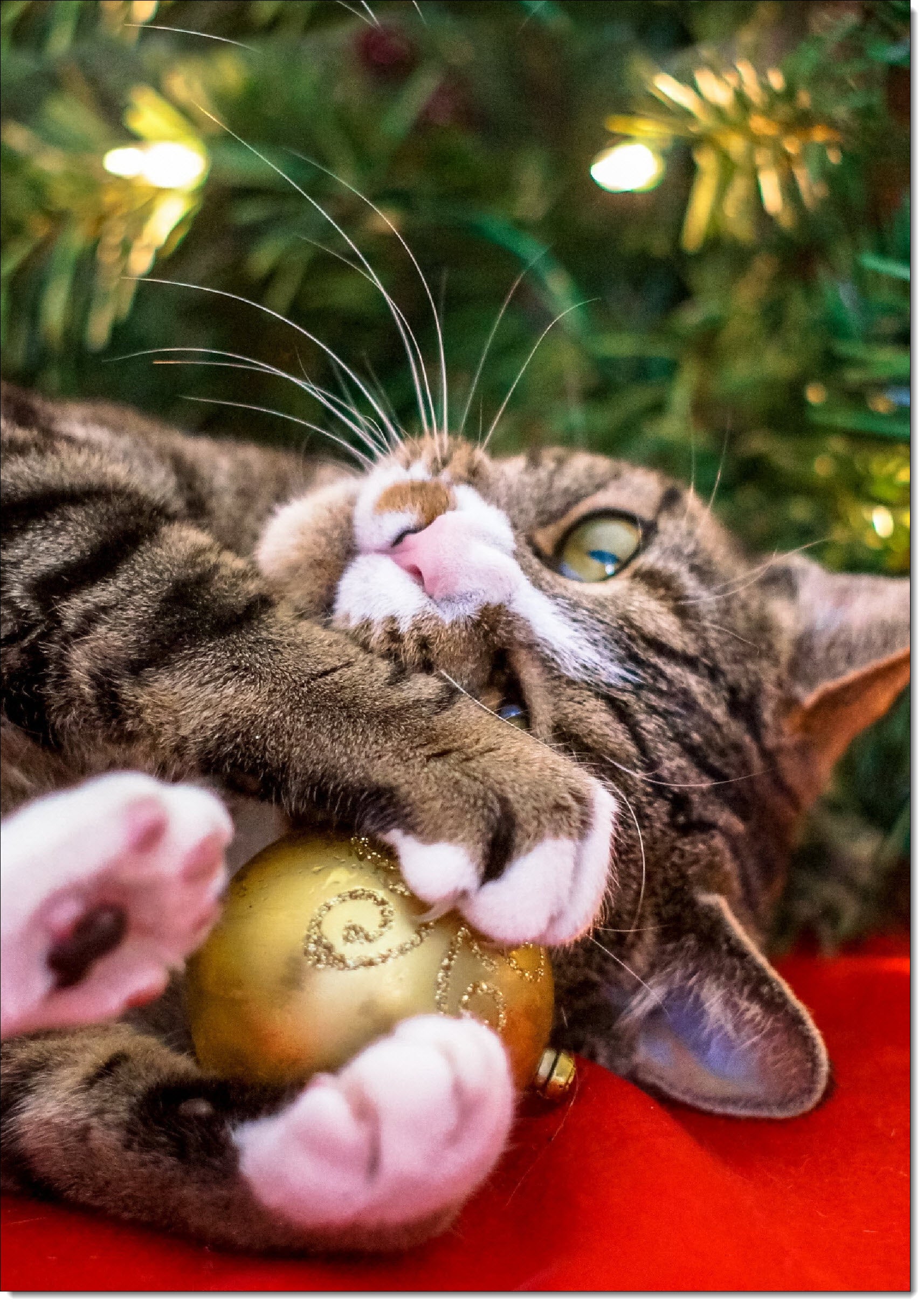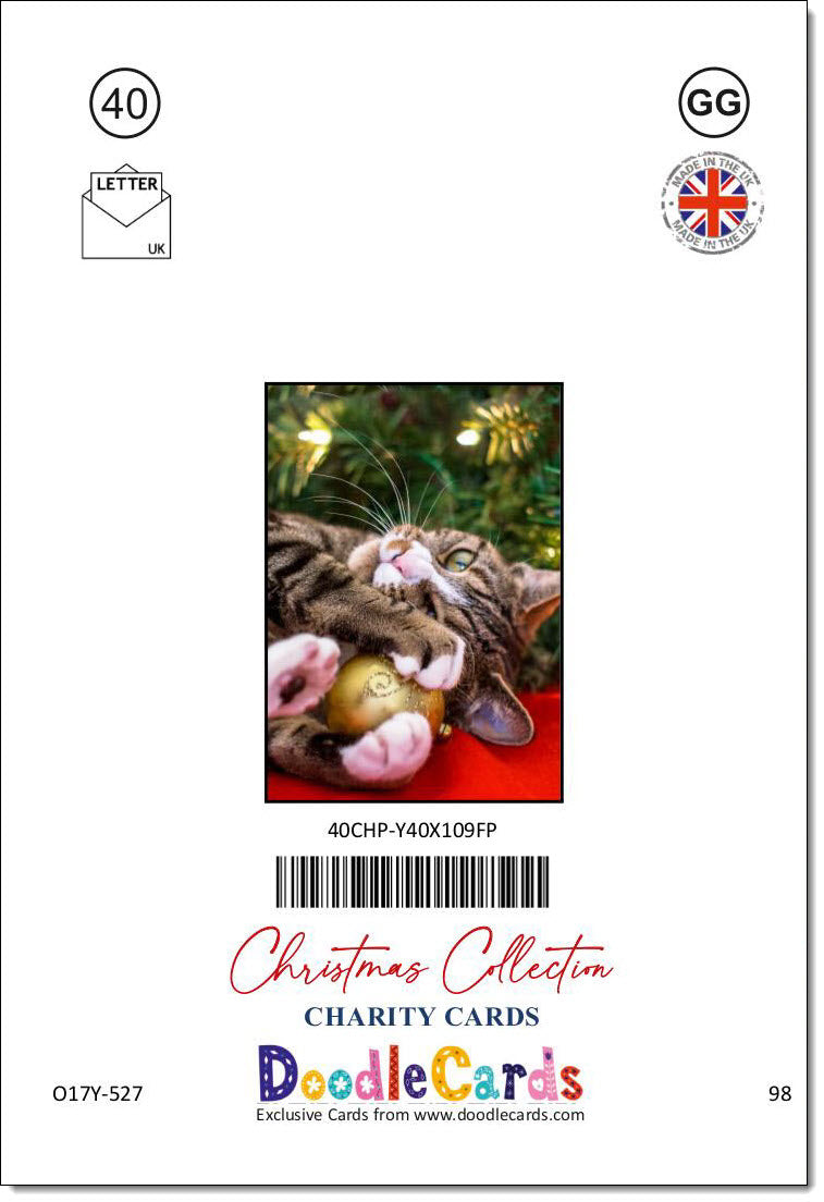Pack of 10 Charity Christmas Cards Tabby Cat playing with Baubles