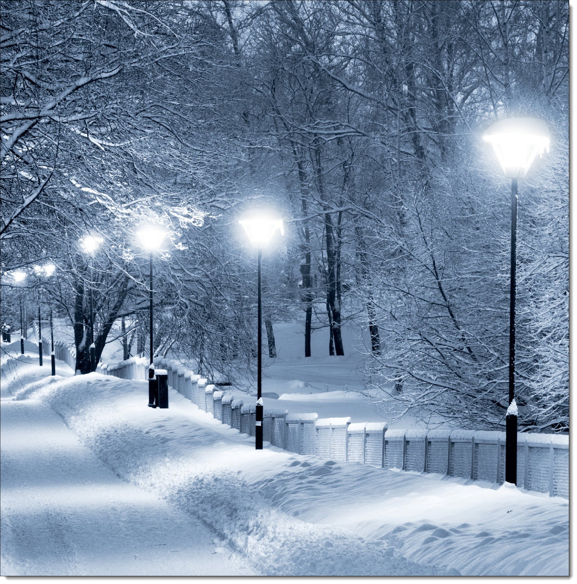Pack of 10 Square Christmas Cards Snowy Park Lamps