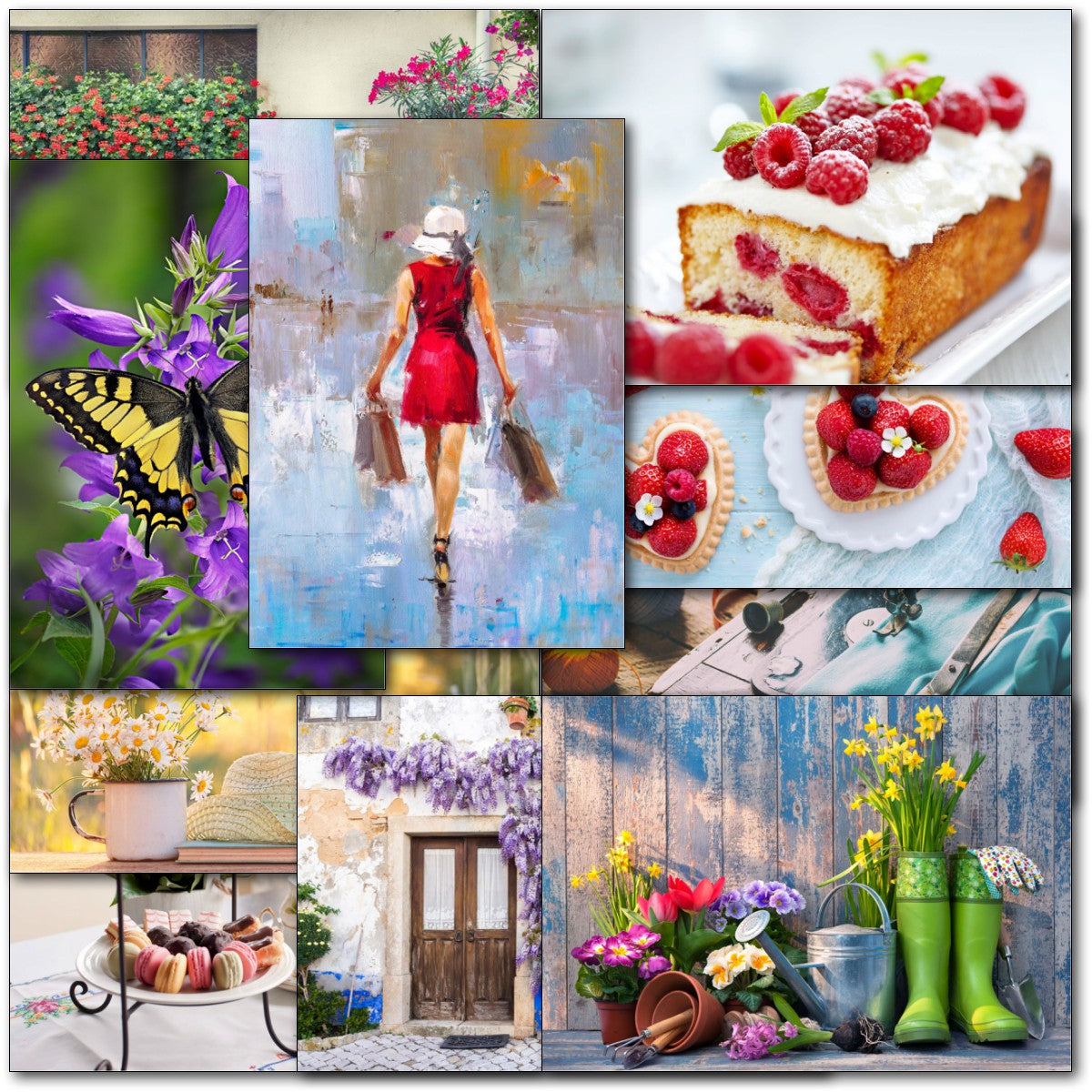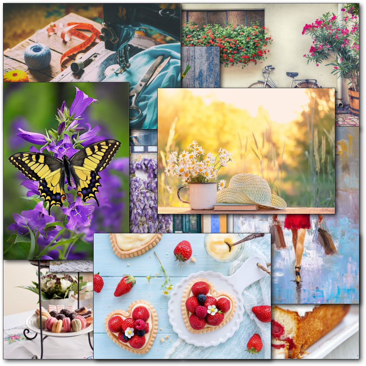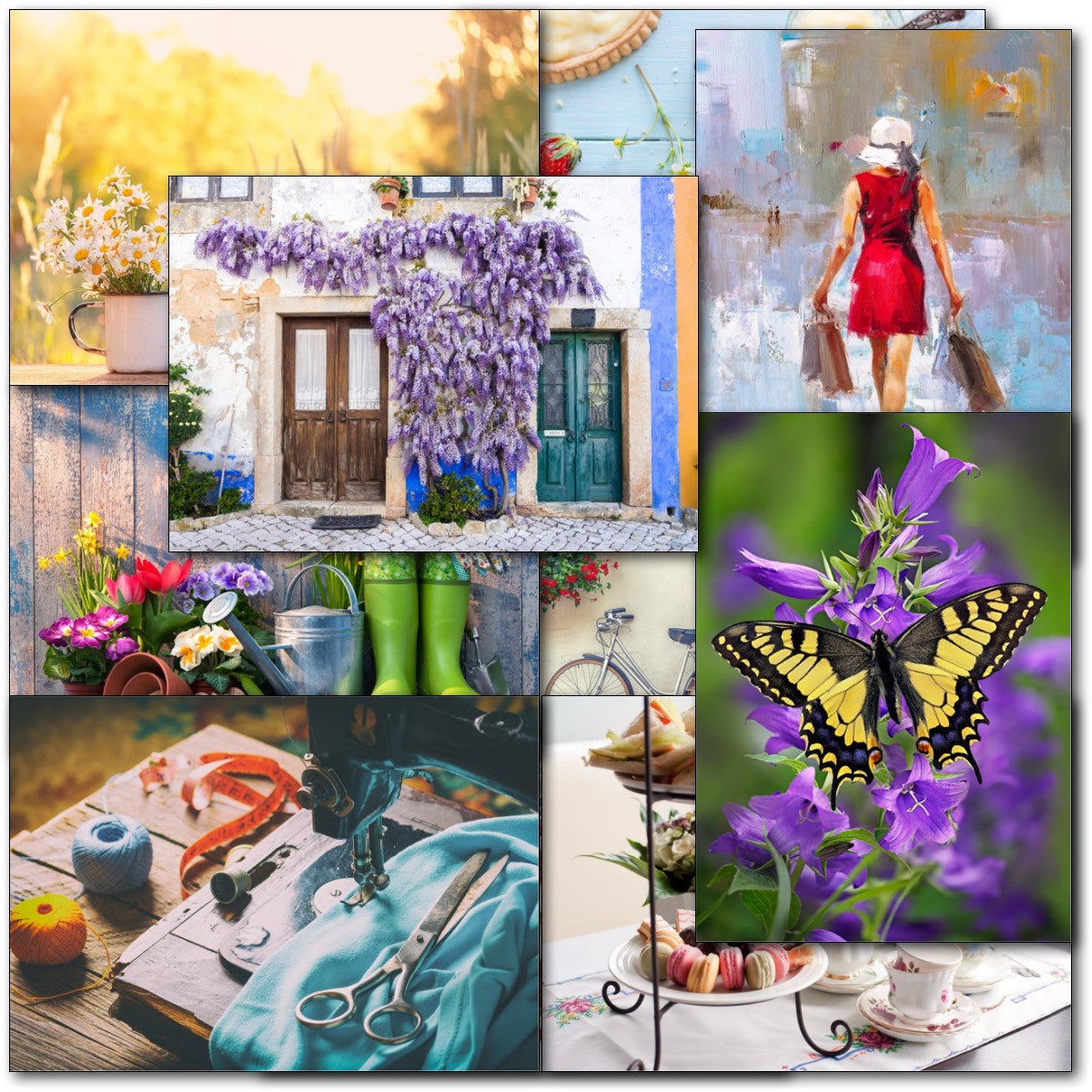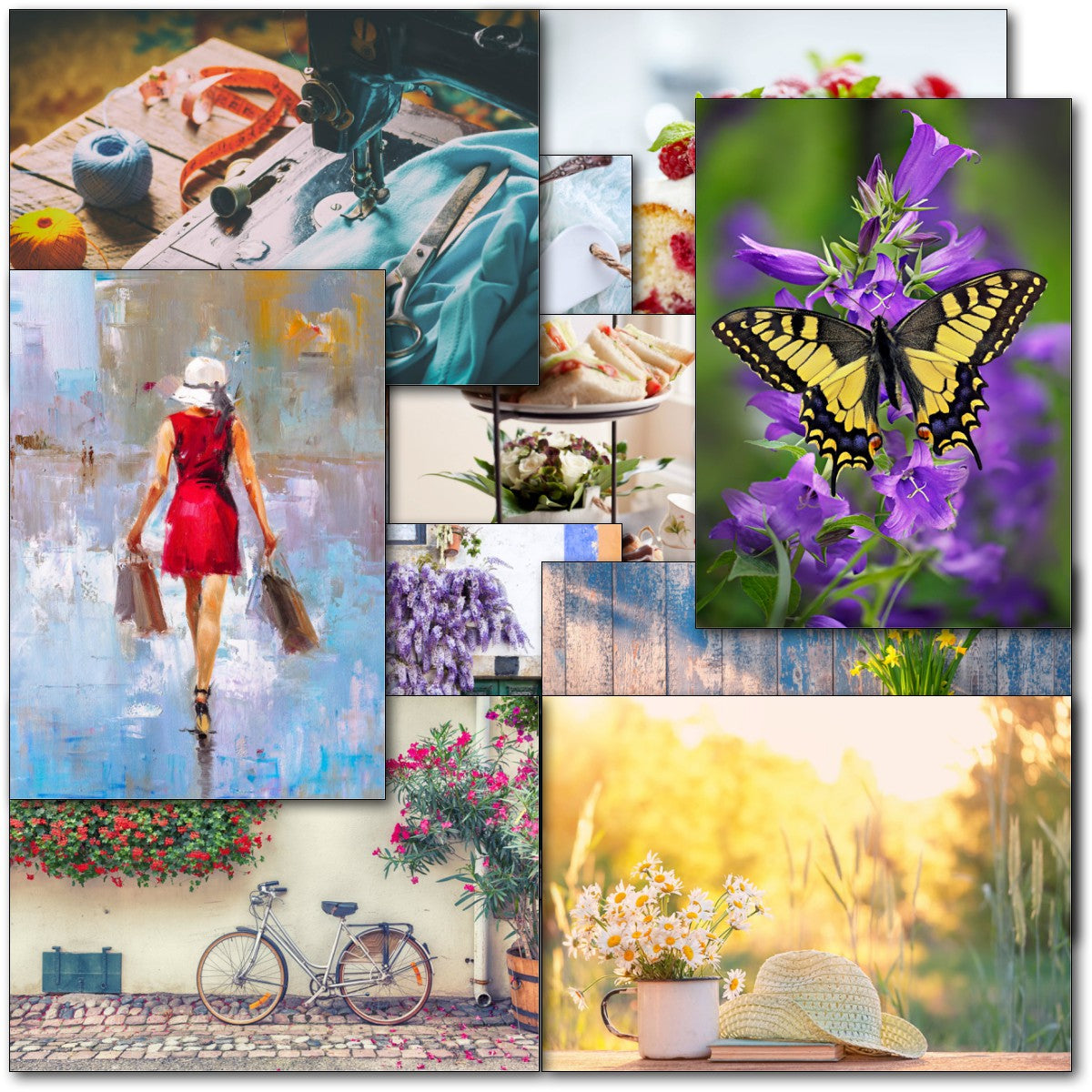 DESIGNS ⭐No more than one card of any design. Therefore pack consists of 10 different cards as shown. Floral Flowers, Butterflies, Cupcakes, Afternoon Tea, Sewing, Bicycle, Bike, Cakes, Girl shopping, Boots Wysteria.⭐