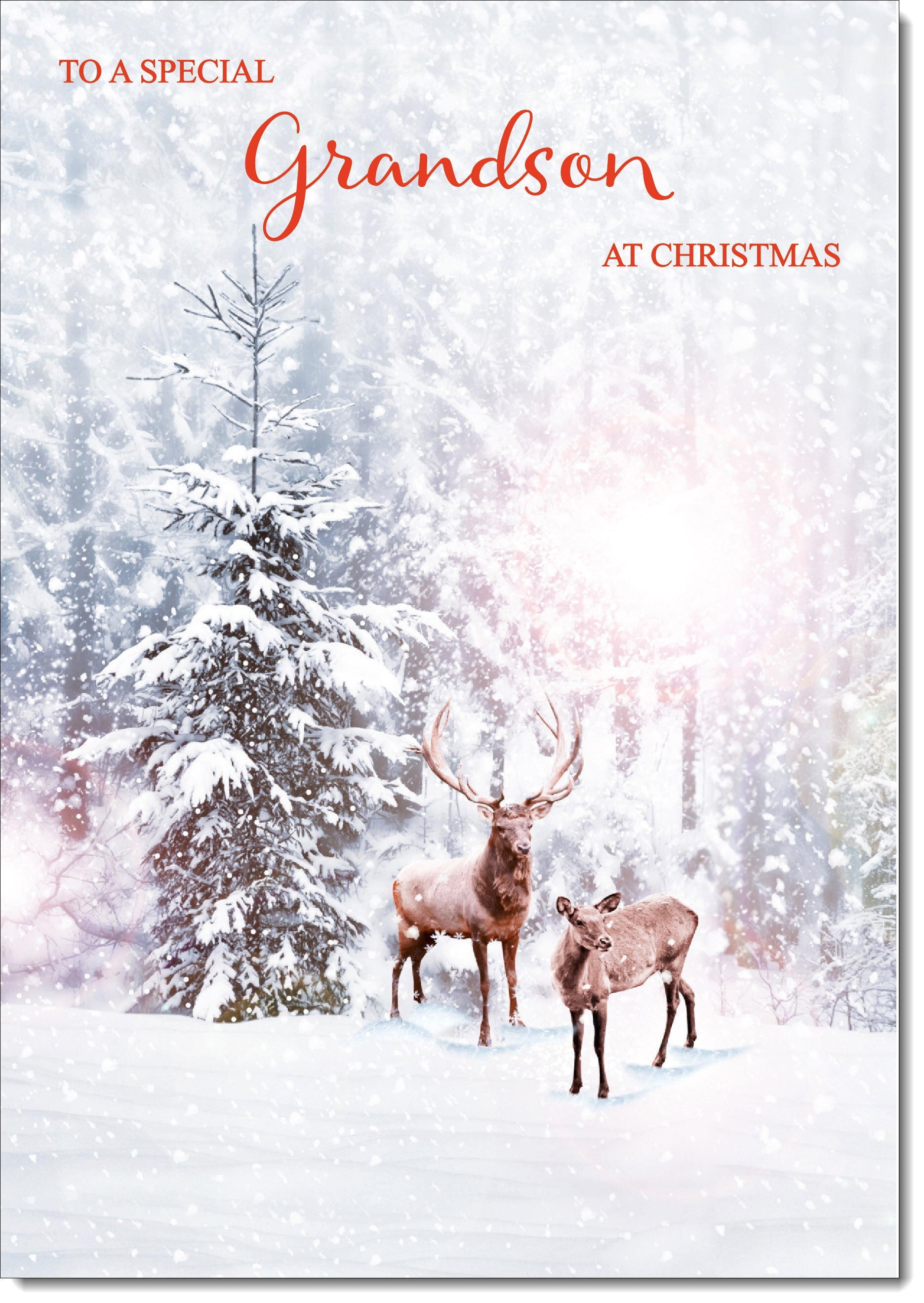 Grandson Christmas Card Stag and Doe in Snowy Forest
