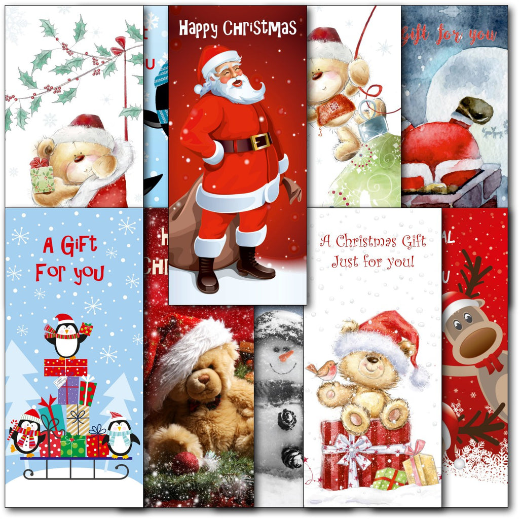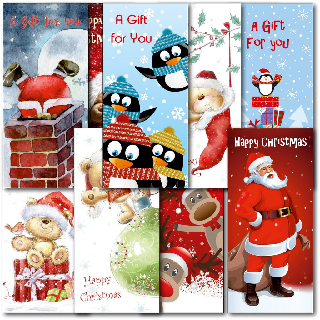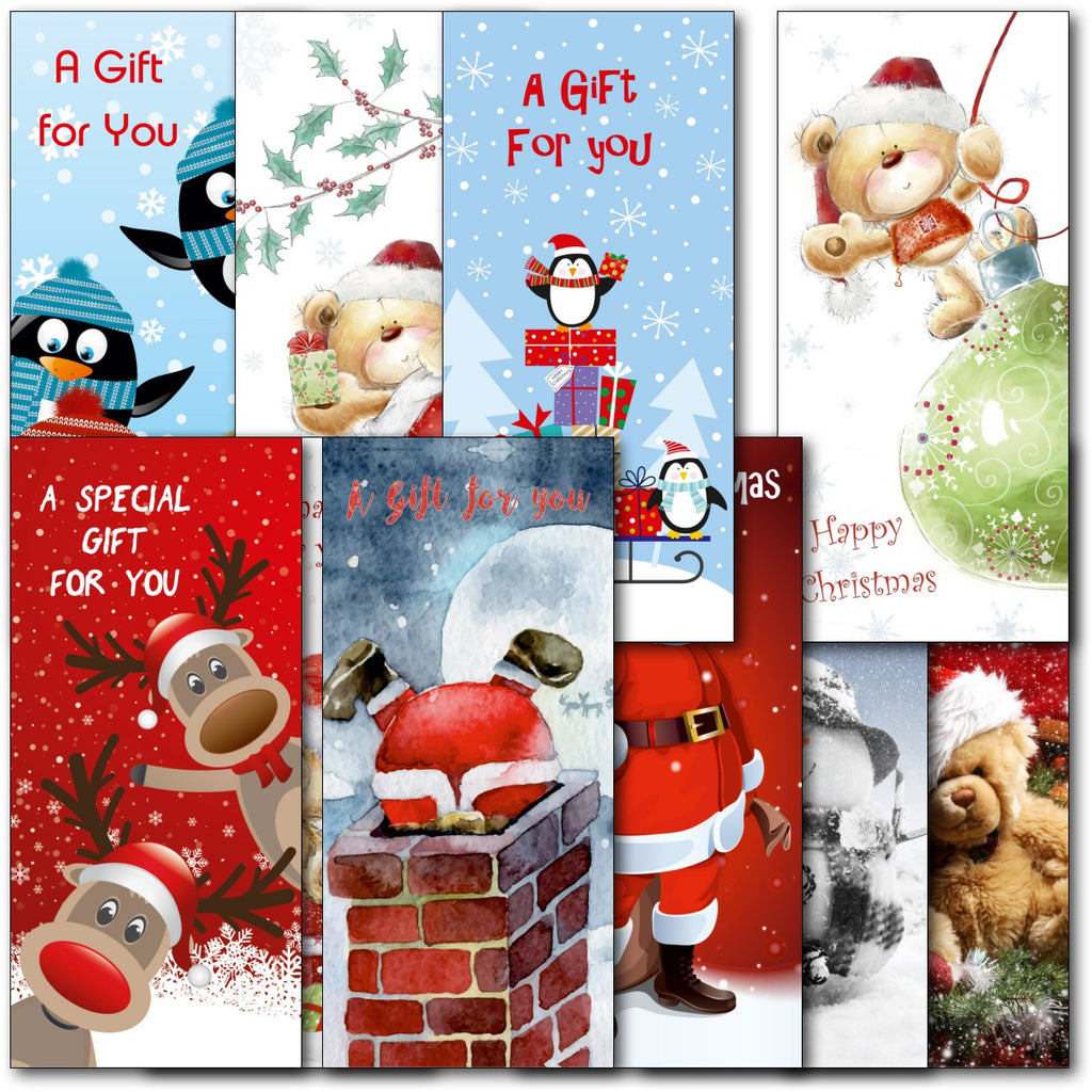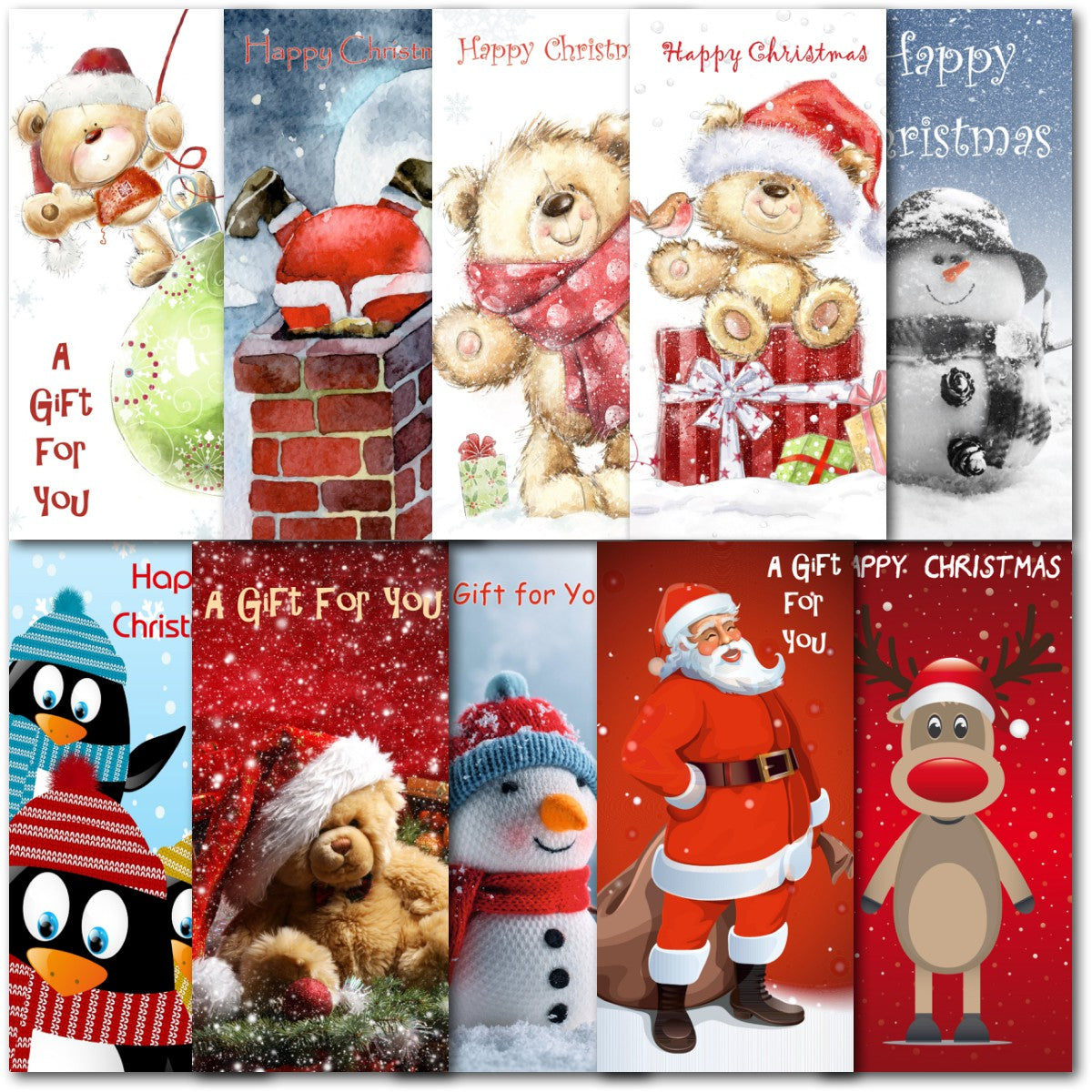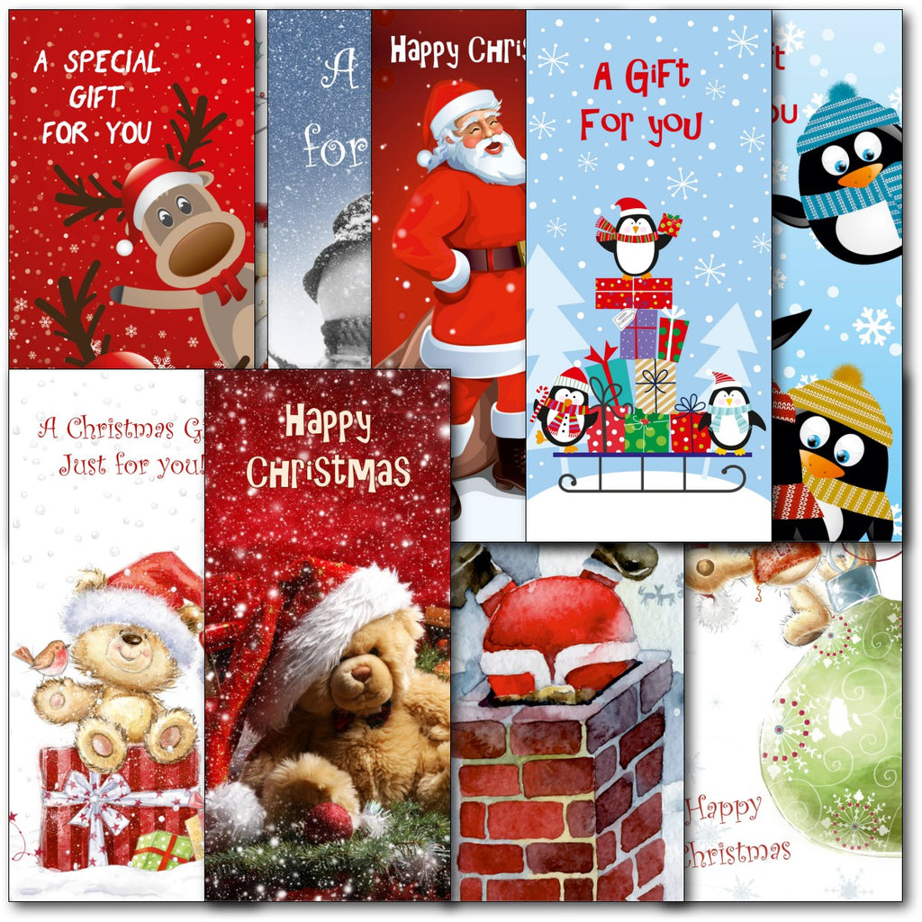 DESIGNS ⭐No more than one money wallet of any design. Therefore pack consists of 10 different designs as shown. 3 fold design to hold voucher or notes inside. Teddies, Father Christmas, Santa, Snowman, Penguins, Rudolph, Presents, Children, Kids, Boys, Girls.⭐