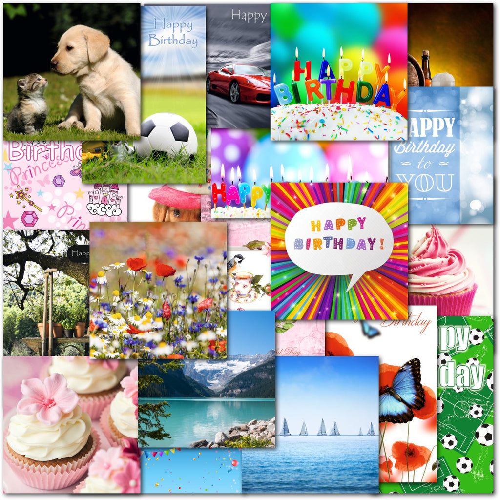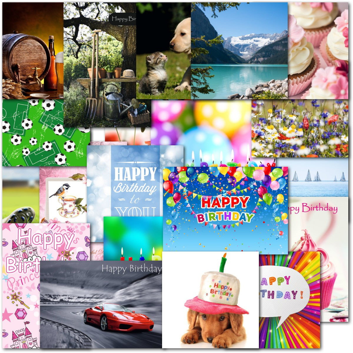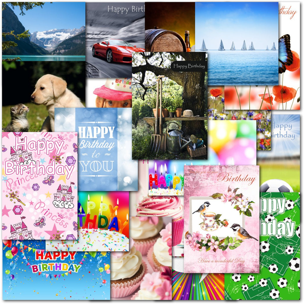 Pack of 20 Family Happy Birthday Cards - Male, Female & Children. Football, Cars, Beer, Gardening, Boats, Cupcakes, Floral Flowers, Dog, Cat
