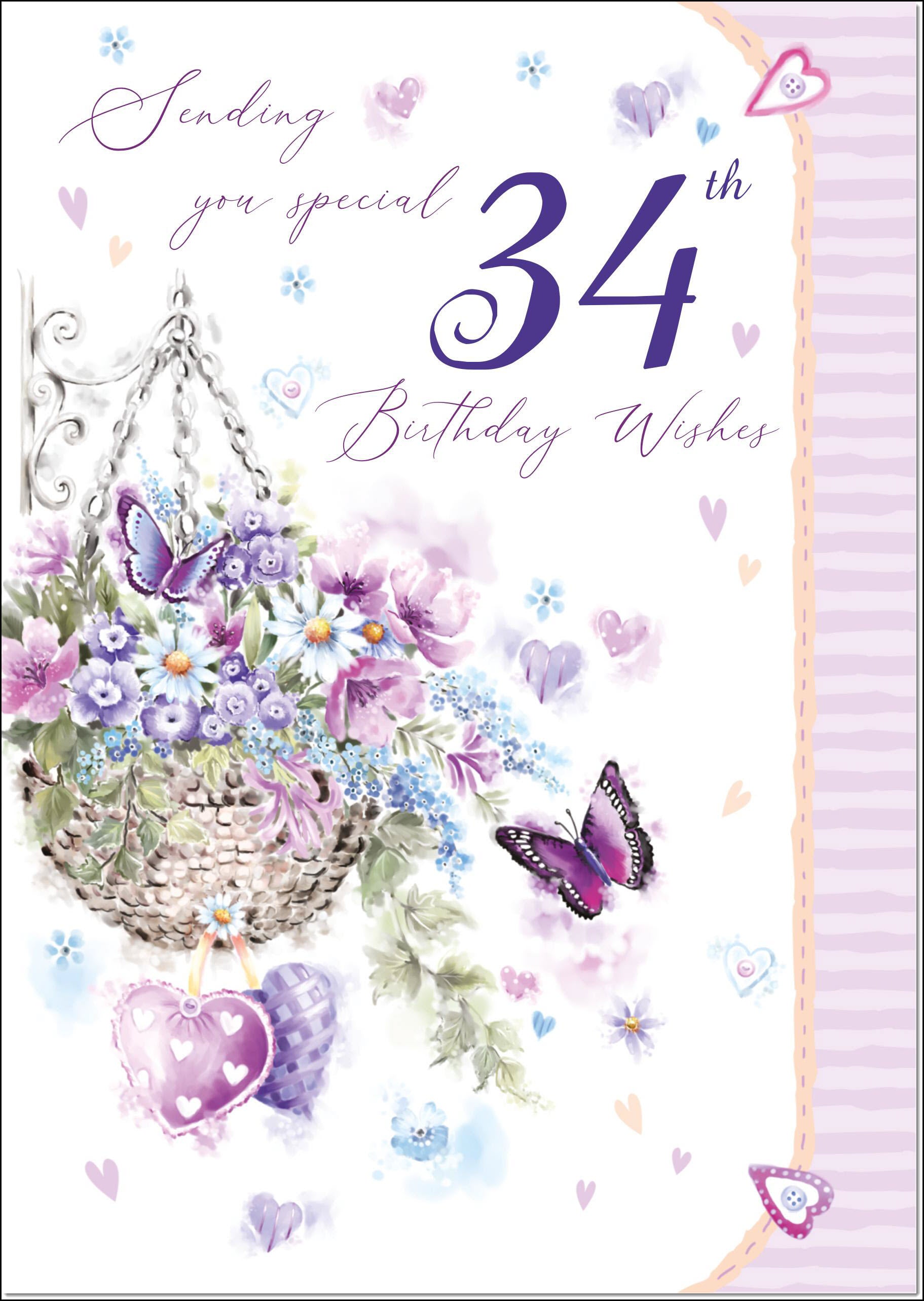 34th Birthday Card Age 34 for Her Purple Hanging Basket