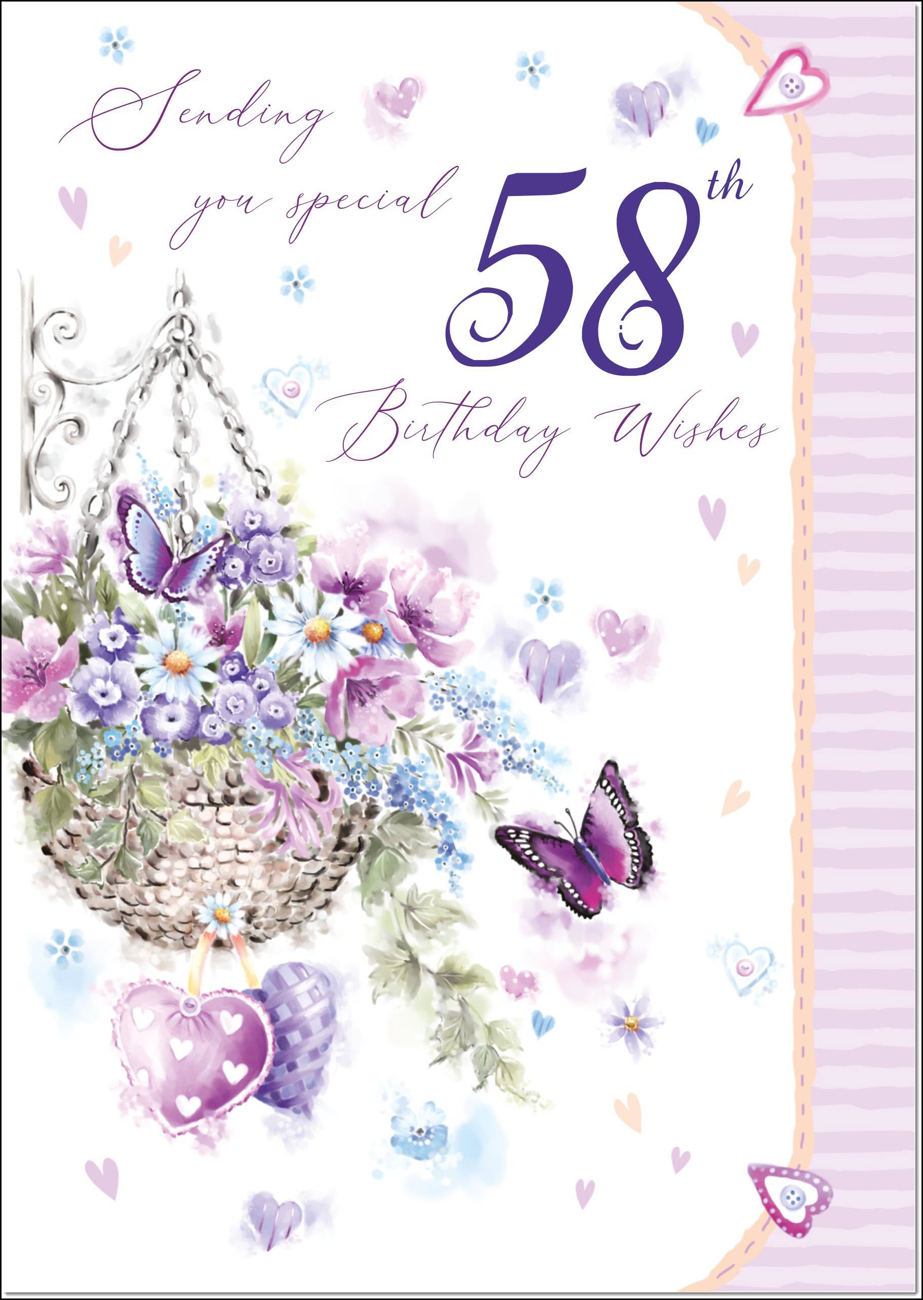 58th Birthday Card Age 58 for Her Purple Hanging Basket