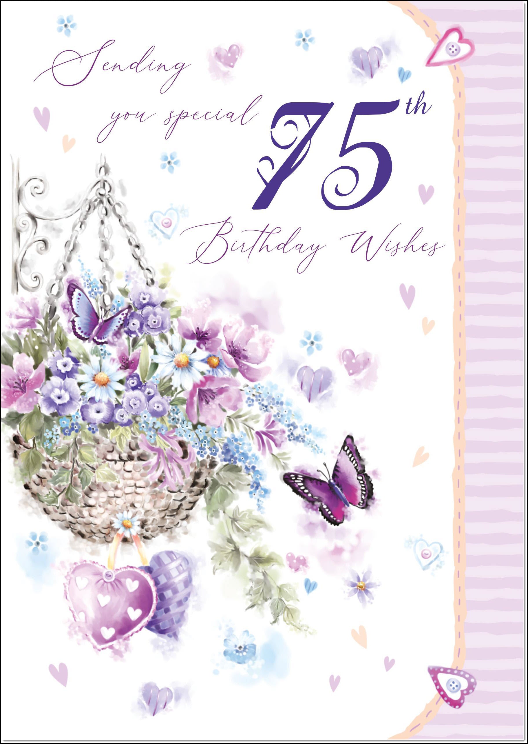 75th Birthday Card Age 75 for Her Purple Hanging Basket