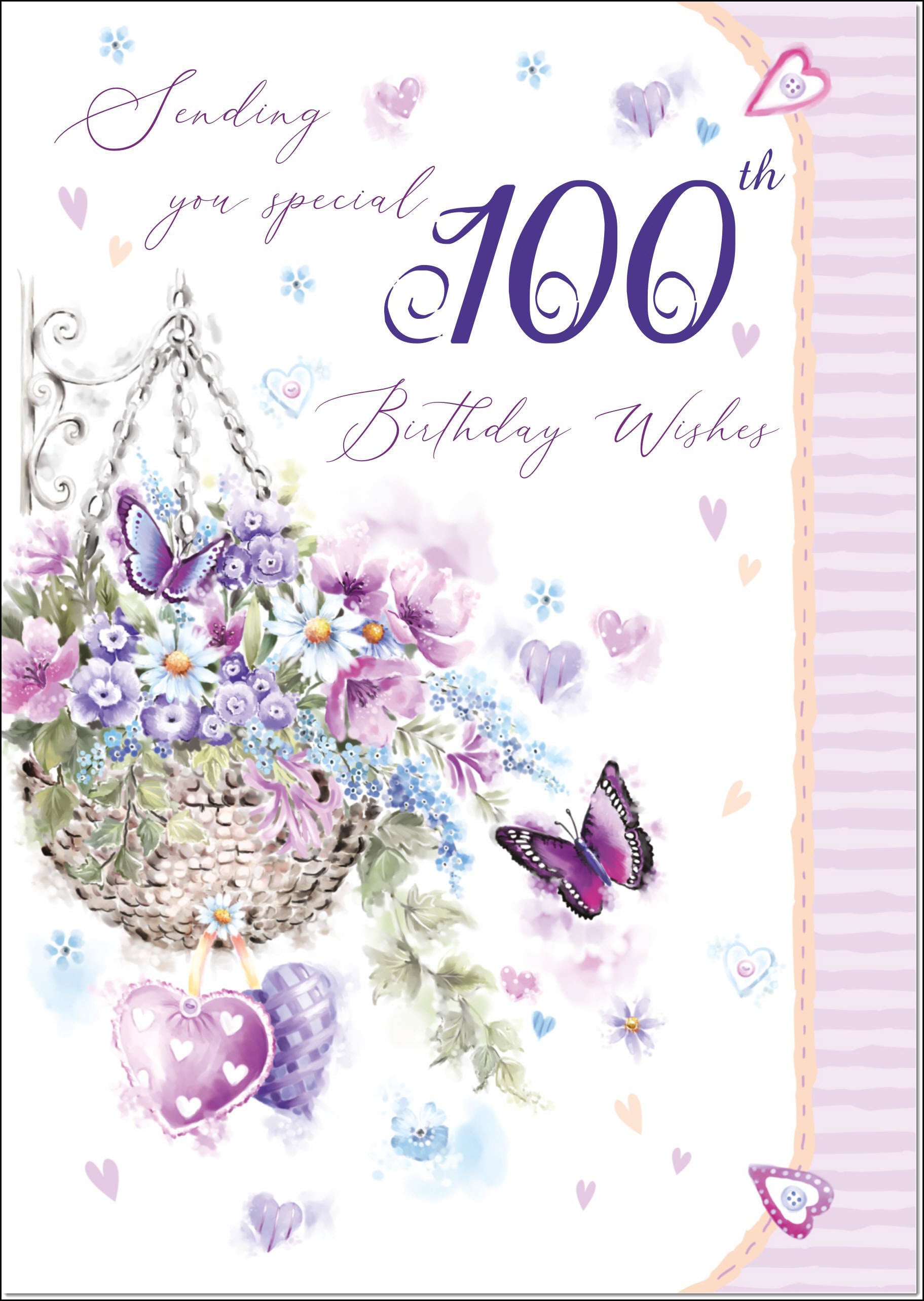 100th Birthday Card Age 100 for Her Purple Hanging Basket