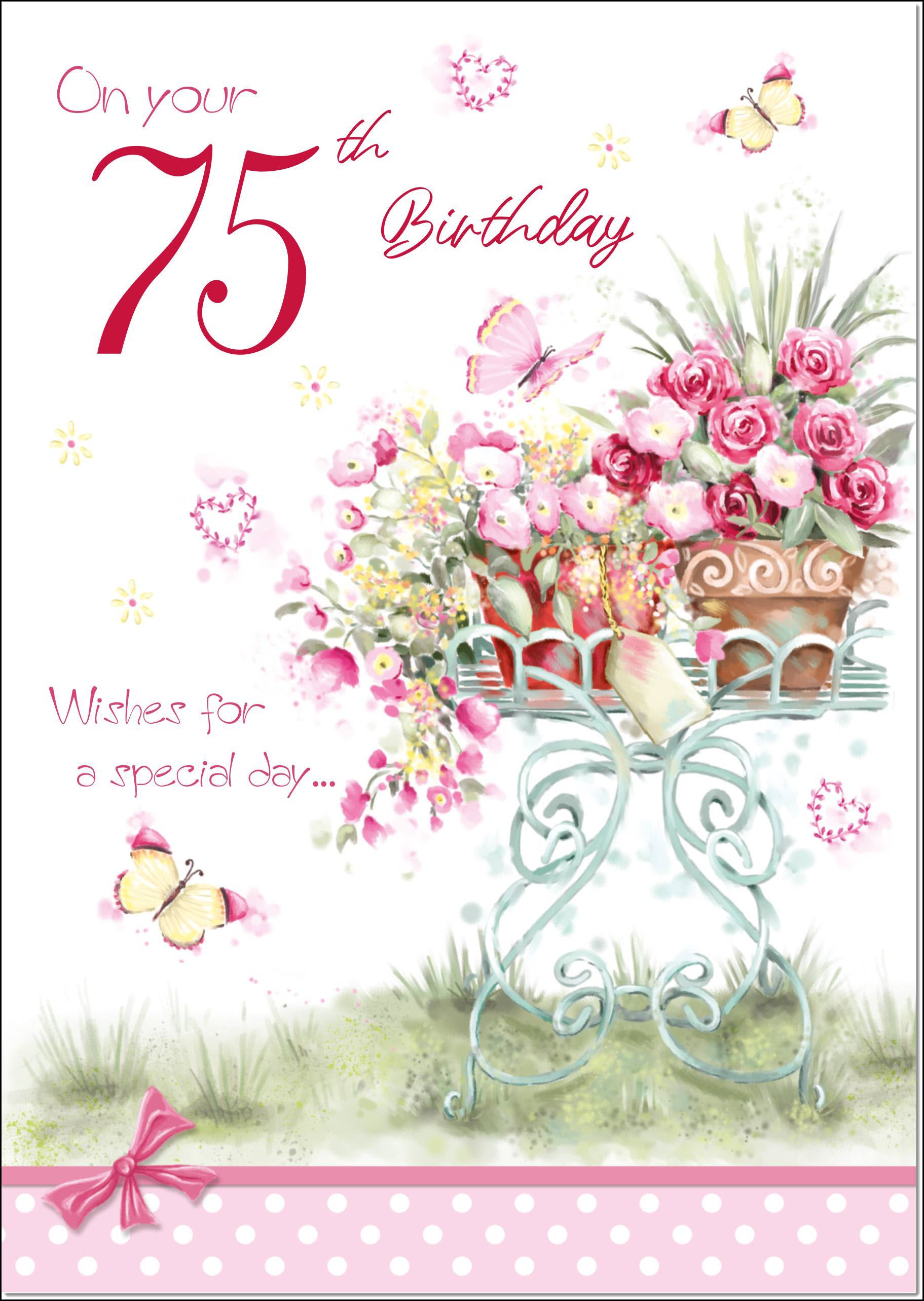 75th Birthday Card Age 75 for Her Pink Floral Plant Pots