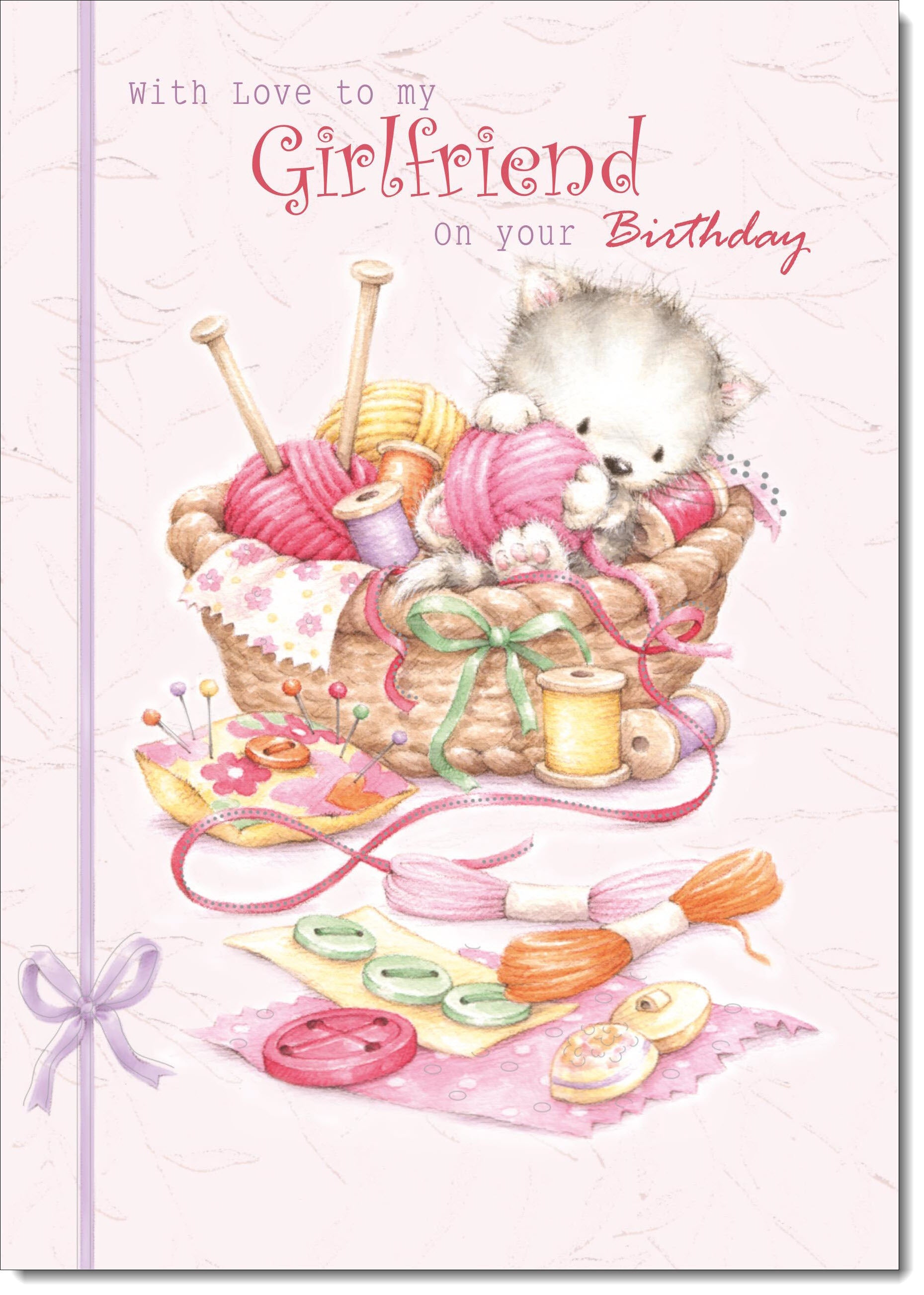 Girlfriend Birthday Card Kitten in Sewing Basket