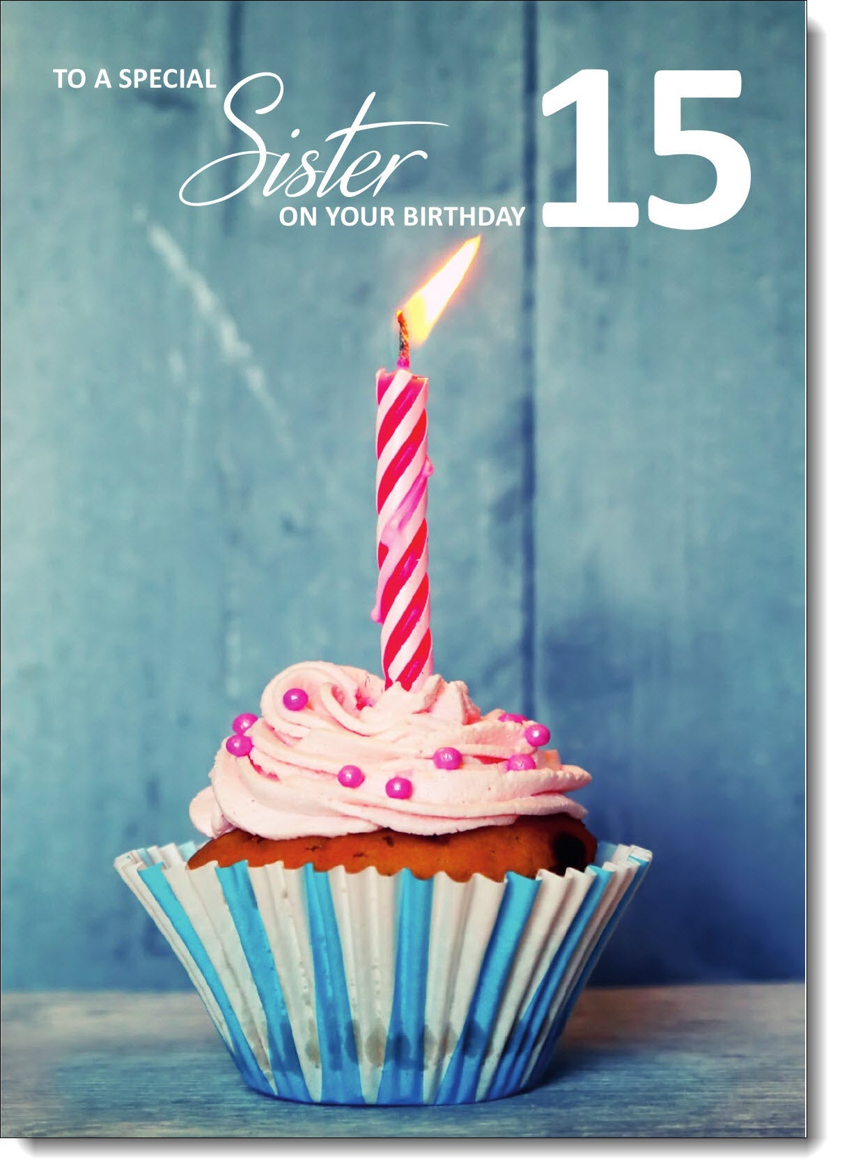 Sister 15th Birthday Card Age 15 Cupcake and Pink Candle