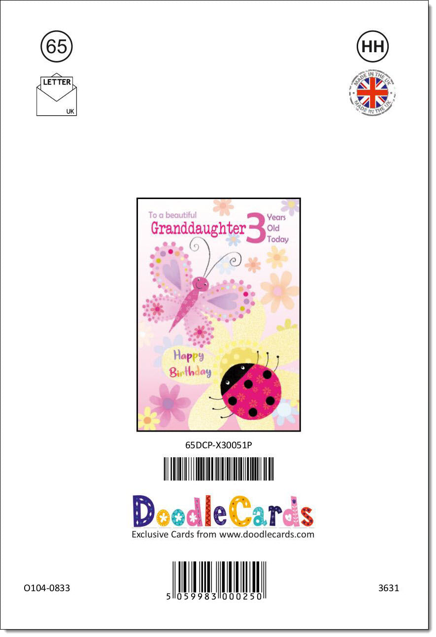 Granddaughter 3rd Birthday Card Age 3 Ladybird and Butterfly