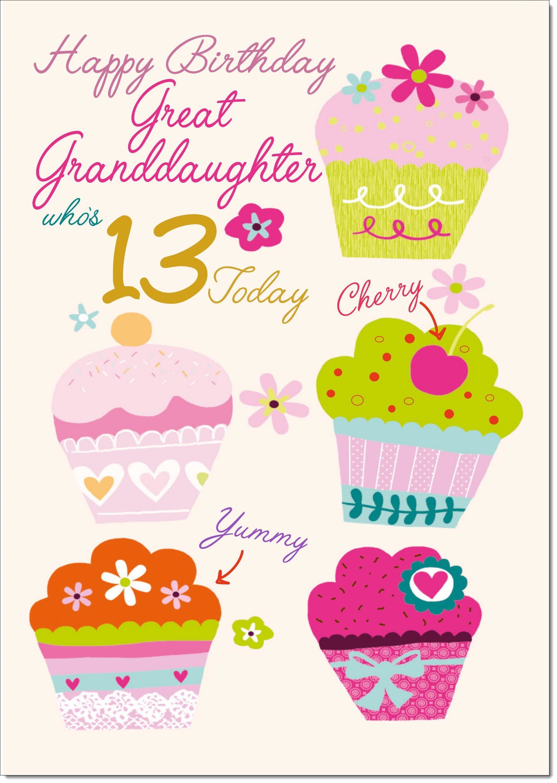 Great Granddaughter 13th Birthday Card Age 13 Bright Cupcakes