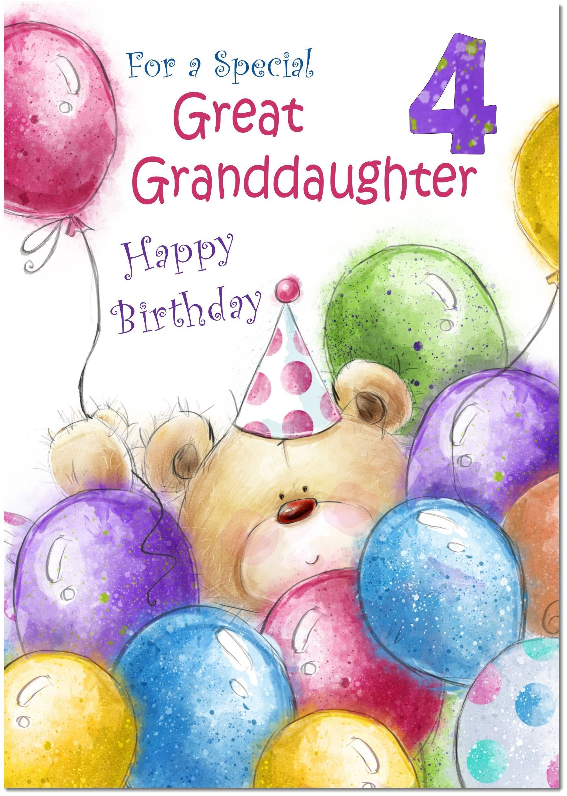 Great Granddaughter 4th Birthday Card Age 4 Cute Teddy Bear in Balloons