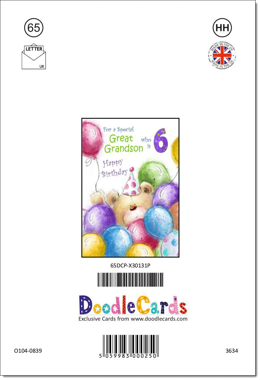 Great Grandson 6th Birthday Card Age 6 Cute Teddy Bear in Balloons