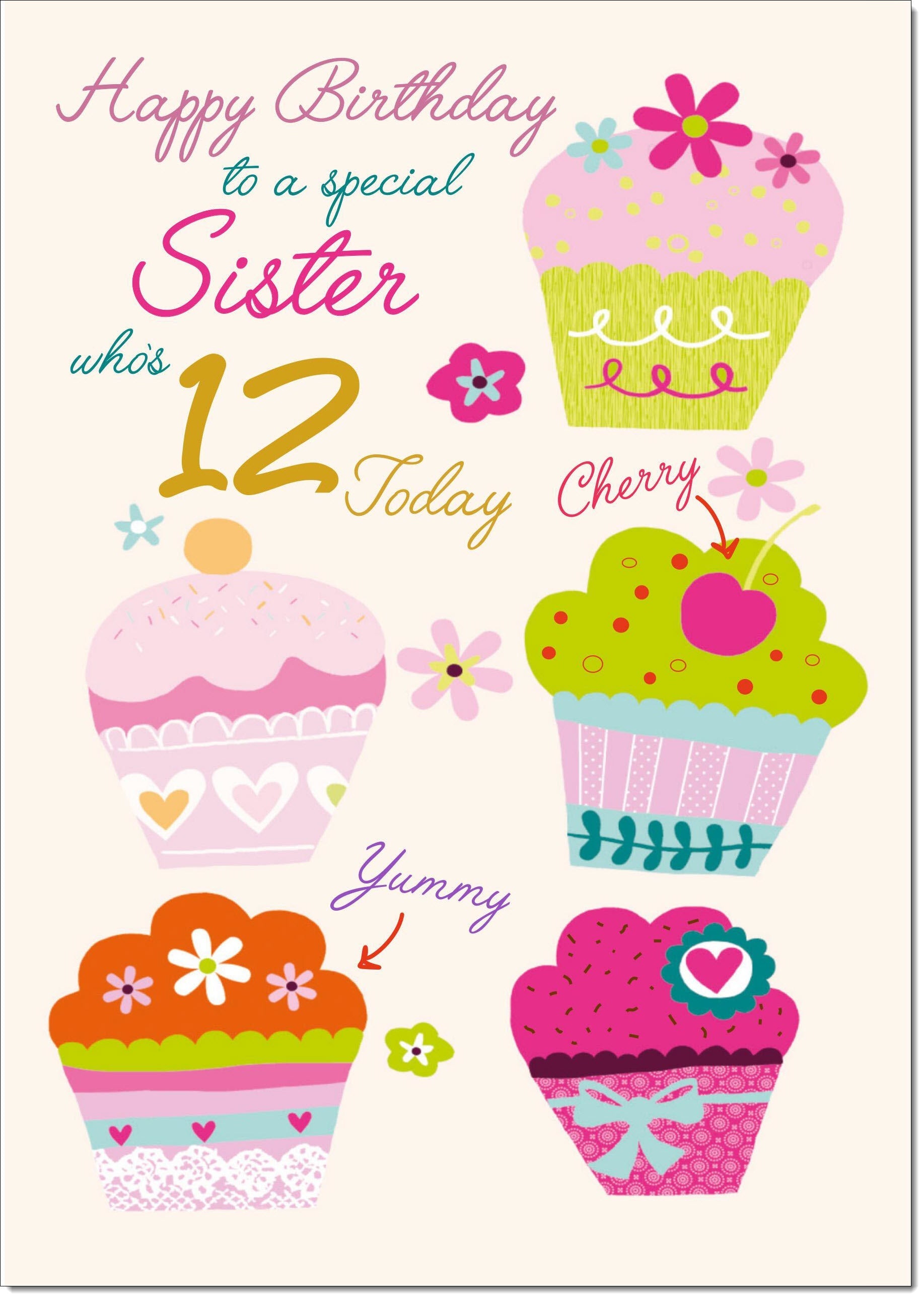 Sister 12th Birthday Card Age 12 Bright Cupcakes