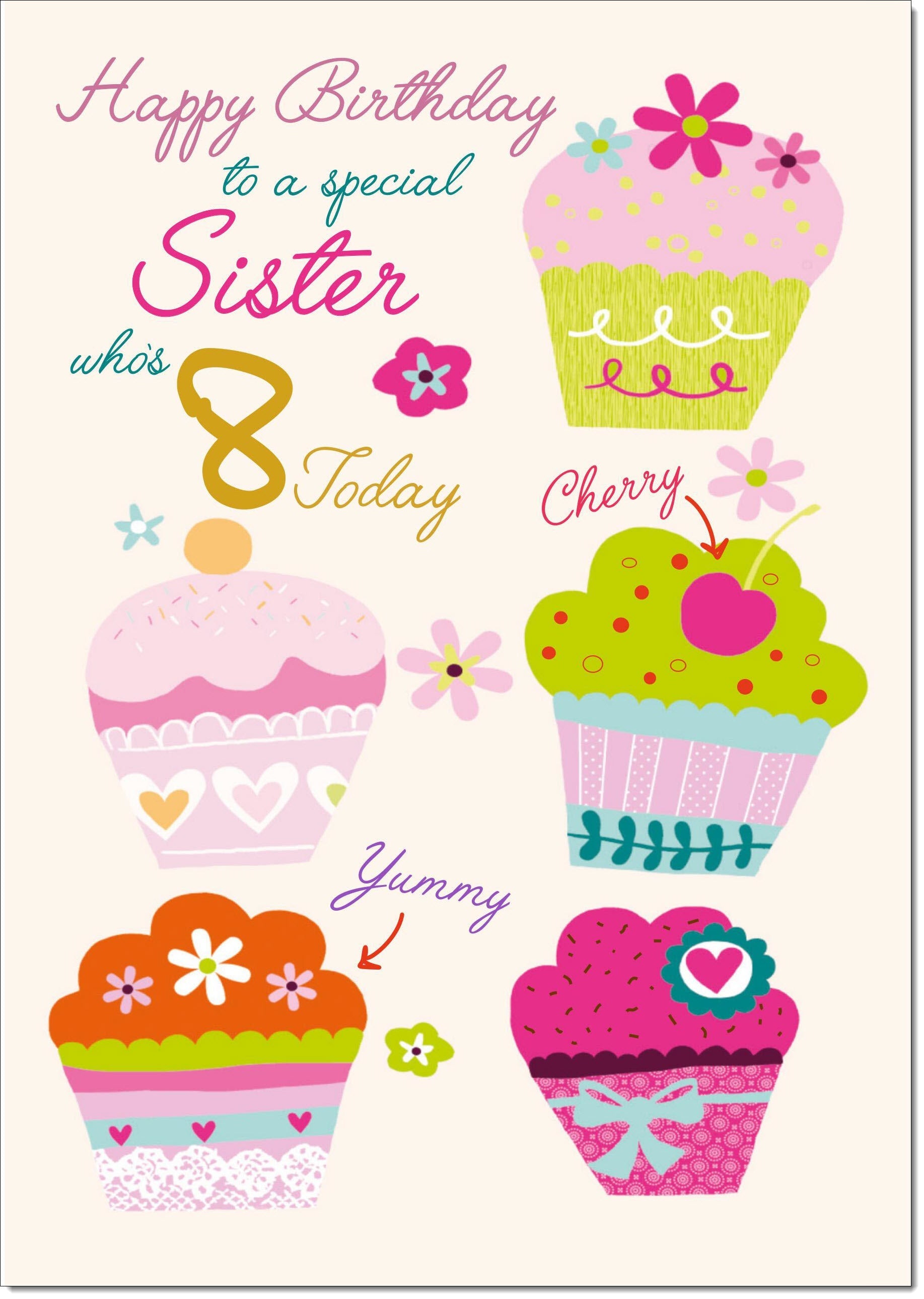Sister 8th Birthday Card Age 8 Bright Cupcakes
