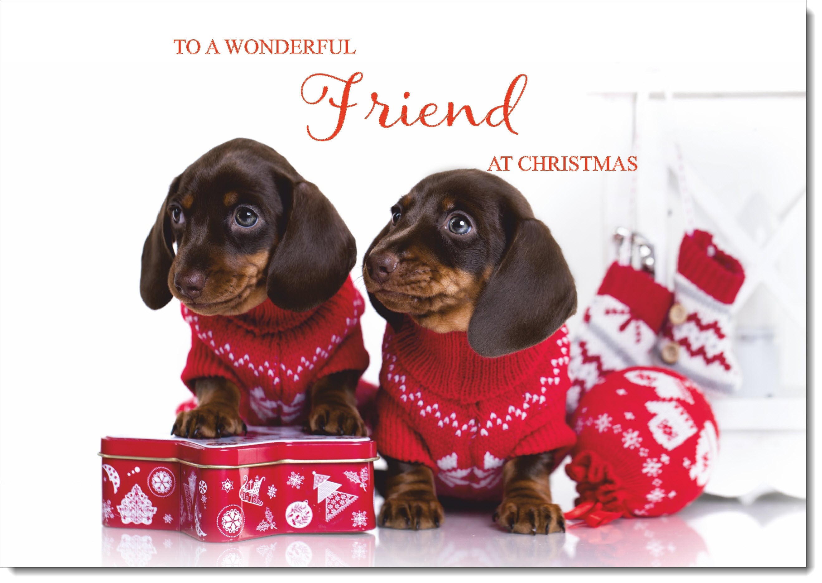 Friend Christmas Card Dachshund Puppies in Christmas Jumpers