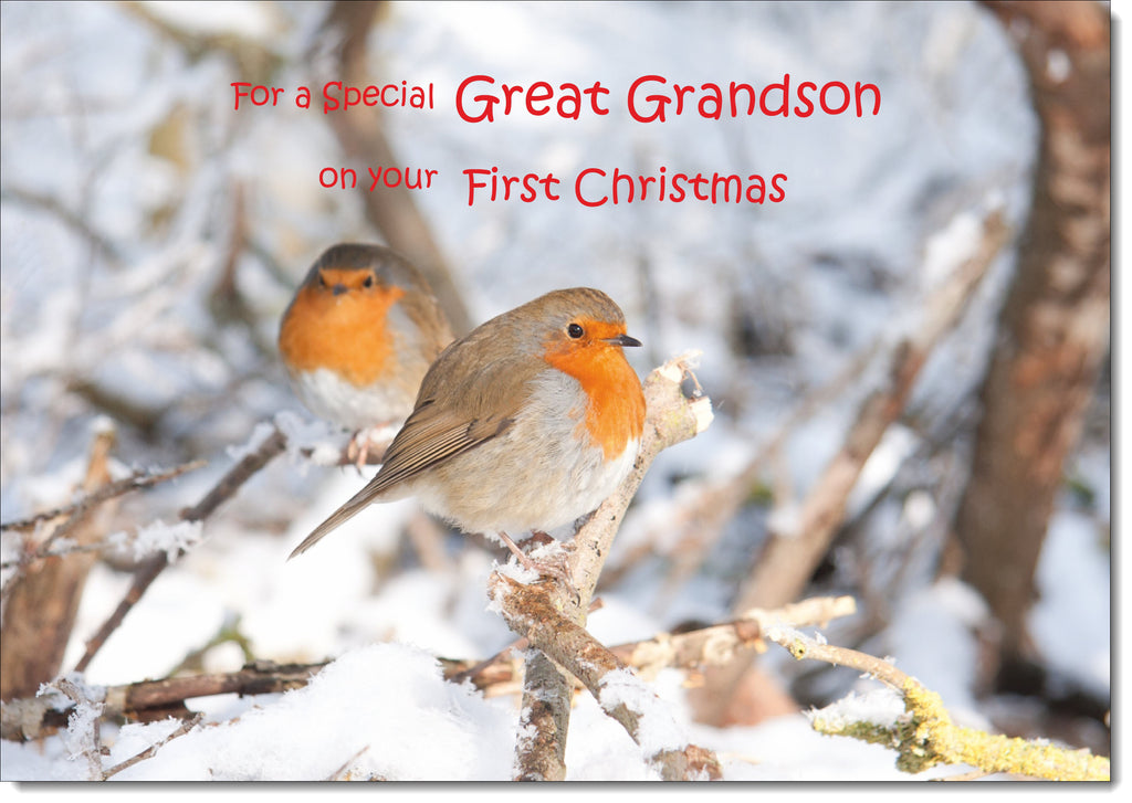 Great Grandsons 1st Christmas Card Two Robins in Tree