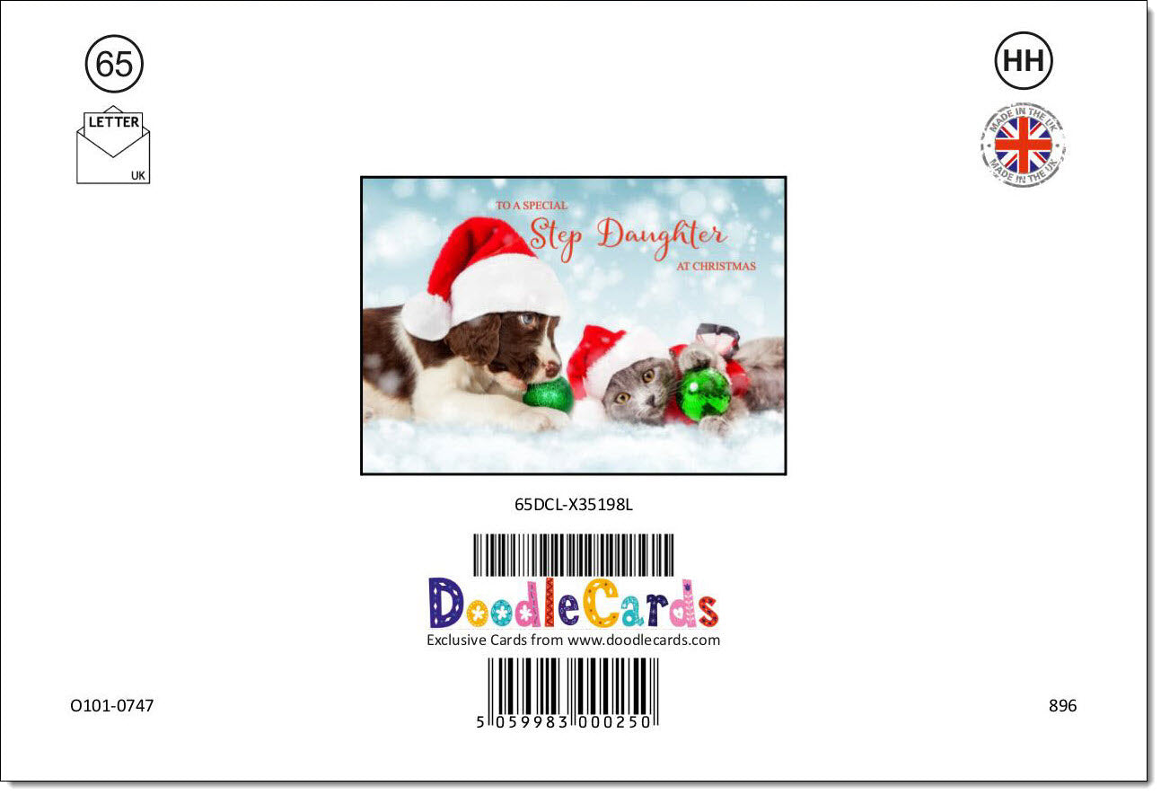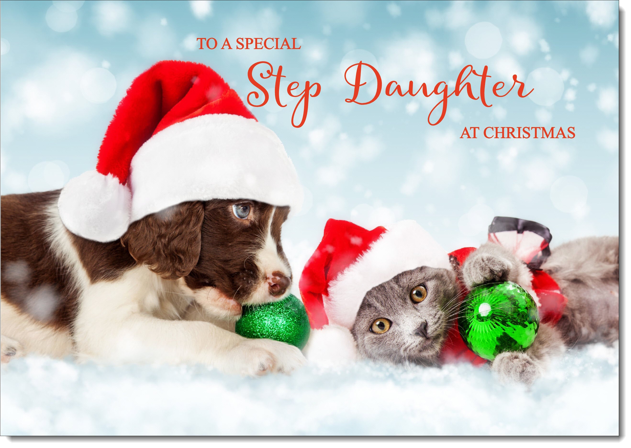 Stepdaughter Christmas Card Puppy and Kitten with Santa Hats