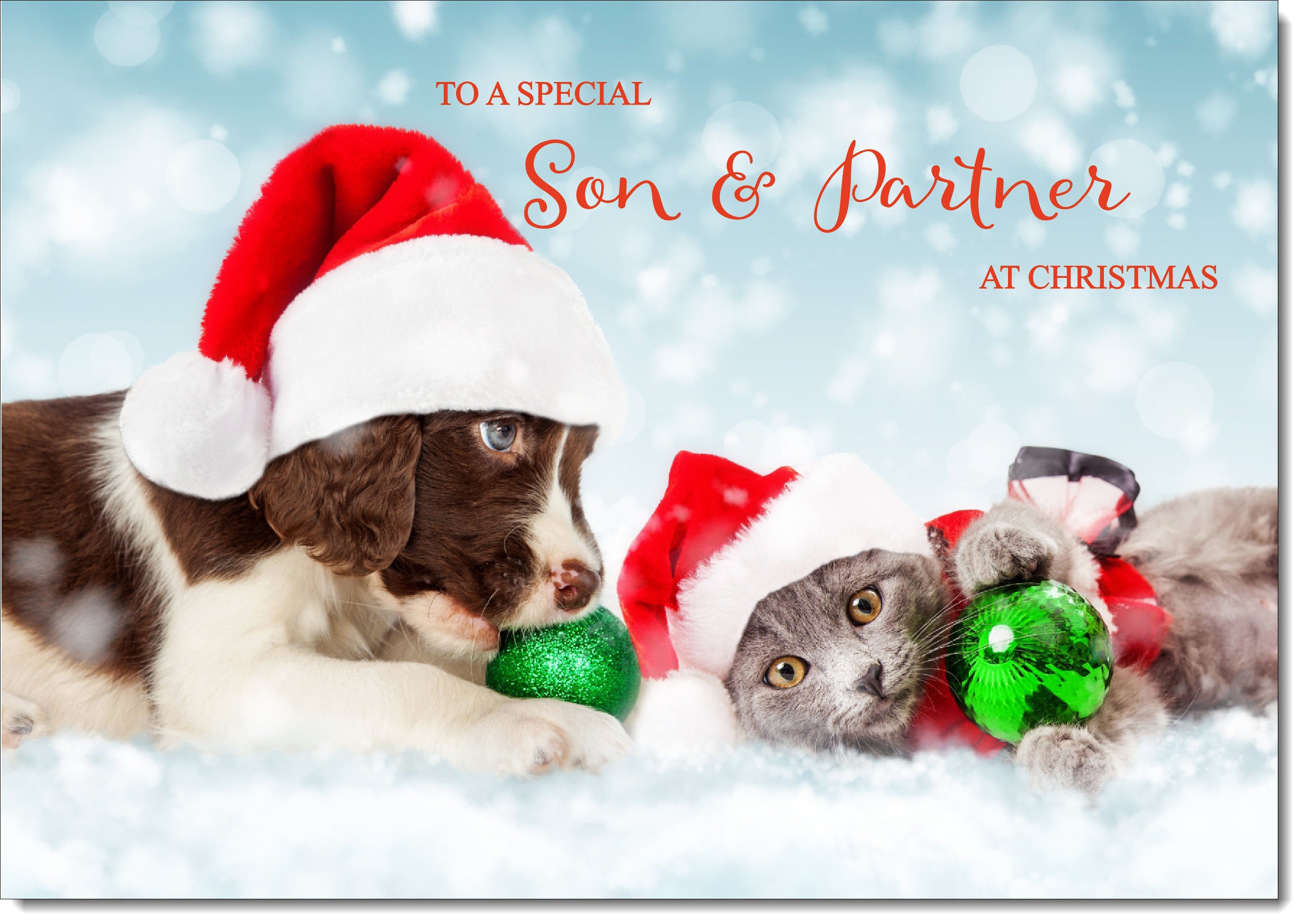 Son & Partner Christmas Card Puppy and Kitten with Santa Hats