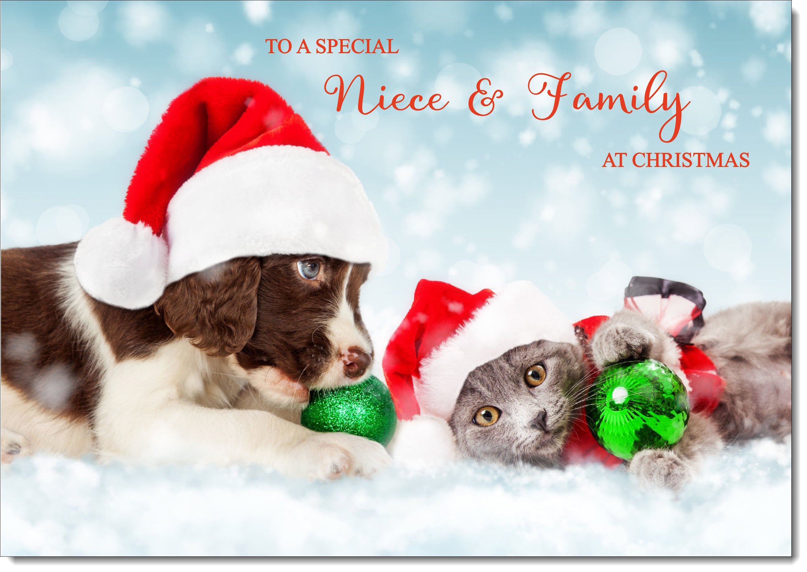 Niece & Family Christmas Card Puppy and Kitten with Santa Hats